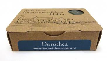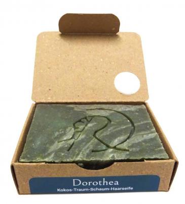 Dorothea ist eine in liebevoller Handarbeit gesiedete Pflanzenölseife, die auf Kokosöl-Basis hergestellt wird. Sie hat eine geringe Überfettung und ist damit gut für schnell fettendes Haar geeignet. Der Einsatz von Avocadoöl und Aprikosenkernöl verleihen der Haarseife pflegende Eigenschaften, die Kopfhaut und Haar zu Gute kommen. Dorothea macht mit ihrem Kokosduft jede Haarwäsche zu einem tropischen Vergnügen. Die Seife sollte für größtmögliche Ergiebigkeit und optimales Wascherlebnis nach jeder Verwendung gut trocknen können.