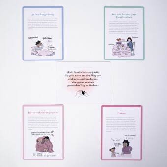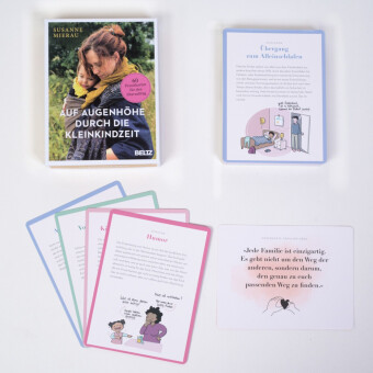Ob Familientisch, bedürfnisorientiertes Einschlafen, gewaltfreie Sprache oder liebevolle Eingewöhnung in die Kita - gerade bei Kleinkindern ist es wichtig, souverän auf ihre emotionalen Bedürfnisse einzugehen. In diesem Kartenset wendet die erfahrene Kleinkindpädagogin und Familienbegleiterin Susanne Mierau ihr Wissen prägnant auf alltägliche Situationen an. So gewinnen Eltern von Kindern zwischen 1 und 5 Jahren Sicherheit und viele Anregungen, um in konkreten alltäglichen Situationen bedürfnisorientiert und auf Augenhöhe mit dem Kind zu interagieren. Die insgesamt 60 Karten des Sets helfen Eltern auch dabei, die Bedürfnisse ihres eigenen inneren Kindes wahrzunehmen: Reflexionskarten geben Impulse, die eigene Erziehung zu reflektieren und sich selbst empathisch zuzuhören. Entlastungskarten nehmen Eltern den Druck und ermutigen sie zu mehr Selbstmitgefühl und -fürsorge. So kann bedürfnisorientierte Elternschaft im Alltag auf Augenhöhe gelingen.