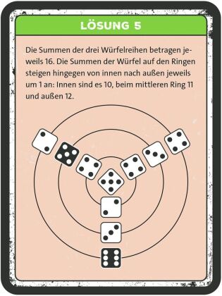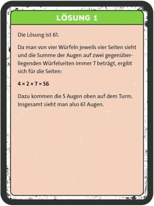 Würfel- und Zahlenrätsel knacken!Würfel, Zahlen, Mathematik und Rätsel - das alles enthält die große Box der Würfeltricks. Mit diesen 50 abwechslungsreichen Rätseln in die faszinierende Welt der Würfel und Zahlen eintauchen. Nicht nur logisches Denken ist gefordert, sondern auch die Fähigkeit mathematische Phänomene zu verstehen. Einfach die vier beiliegenden, hochwertigen Würfel nehmen und direkt loslegen! Viel Spaß beim Rätseln, Tüfteln und Knobeln!