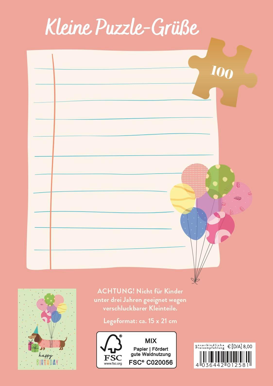 Originelles 100-Teile-Puzzle mit GeburtstagsgrüßenOb als Ersatz für eine Glückwunschkarte zum Geburtstag, als kleines Geschenk für eine liebe Kollegin, oder als Ergänzung zu einem selbstgemachten Kuchen oder einem Strauß Blumen für Familie oder Freunde - das Mini-Puzzle verbindet jede Gratulation mit einem einzigartigen Puzzle-Erlebnis. Auf der Rückseite der hochwertigen Schachtel ist Platz, um eine individuelle und persönliche Nachricht in ein Notizfeld zu schreiben.Dank des handlichen Formats ist die Box ideal zum Mitnehmen für den Puzzle-Spaß unterwegs. Die 100 Puzzleteile sind in einer edlen Papiertüte aufbewahrt, damit nichts verloren geht. Der bedruckte Deckel und eine Miniatur-Abbildung auf dem Boden des Puzzle-Kartons dienen als Motiv-Vorlage. Das fertige Puzzle ist ca. 15 x 21 cm groß.Ein charmantes kleines Geschenk zum Geburtstag, das garantiert ein Lächeln auf das Gesicht zaubert.