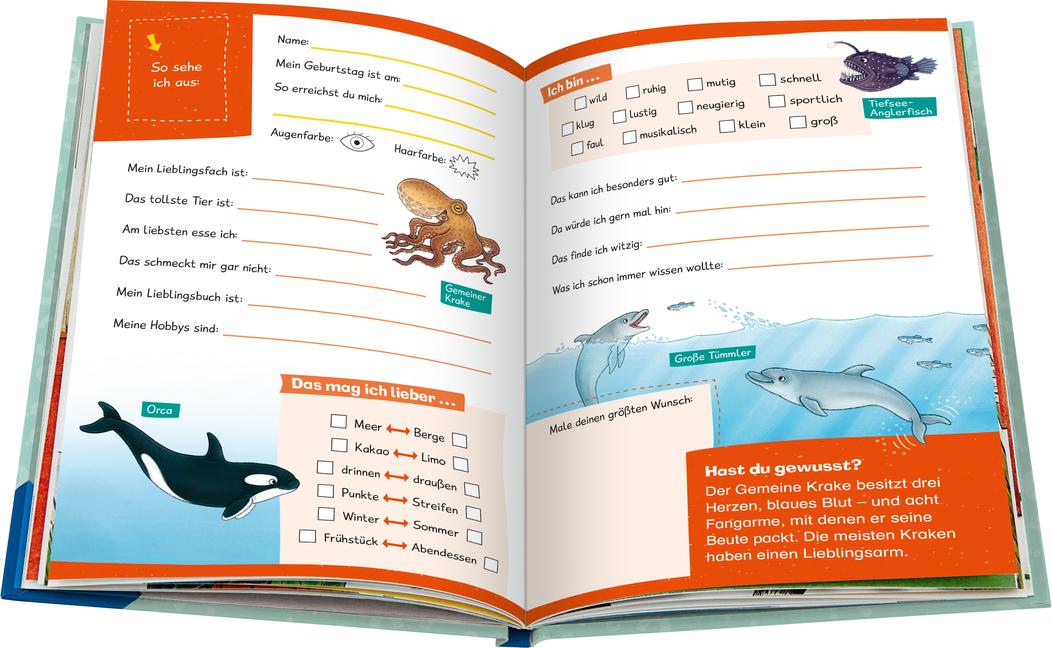 Name, Geburtstag, Augenfarbe - aber auch Lieblingstier, größter Wunsch und leckerstes Essen: Hier kann jedes Kind eintragen, ankreuzen und aufmalen, was es am liebsten mag und macht. Außerdem gibt es auf jeder Doppelseite spannende Infos zu entdecken zu jeweils einem von fünf Lieblingsthemen: Weltraum, Dinosaurier, Pferde, Tiere und Meer. Das Buch ist der perfekte Begleiter für neugierige Grundschulkinder, die alles über ihre Freundinnen und Freunde wissen wollen.