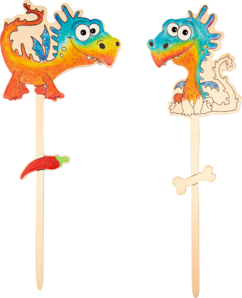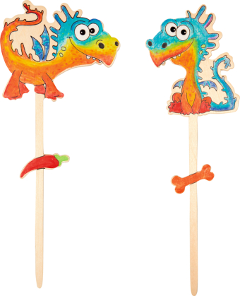 Furzipups in drei verschiedenen Posen aus Sperrholz zum Bemalen. So geht's: Die Drachen mit Bunt- oder Filzstiften, Wasser- oder Plakatfarbe bunt anmalen. Anschließend die Drachen mit Klarlack besprühen, dann sind sie wetterfest. Ideal für Blumentopf, Garten und Balkon!