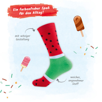 Naschen erlaubt! Dank dieser süßen Kleinigkeit macht man garantiert immer eine gute Figur. Mit originellen und leckeren Motiven sind diese Socken das perfekte Geschenk für alle Naschkatzen. Ein Paar in Einheitsgröße 37 - 42.