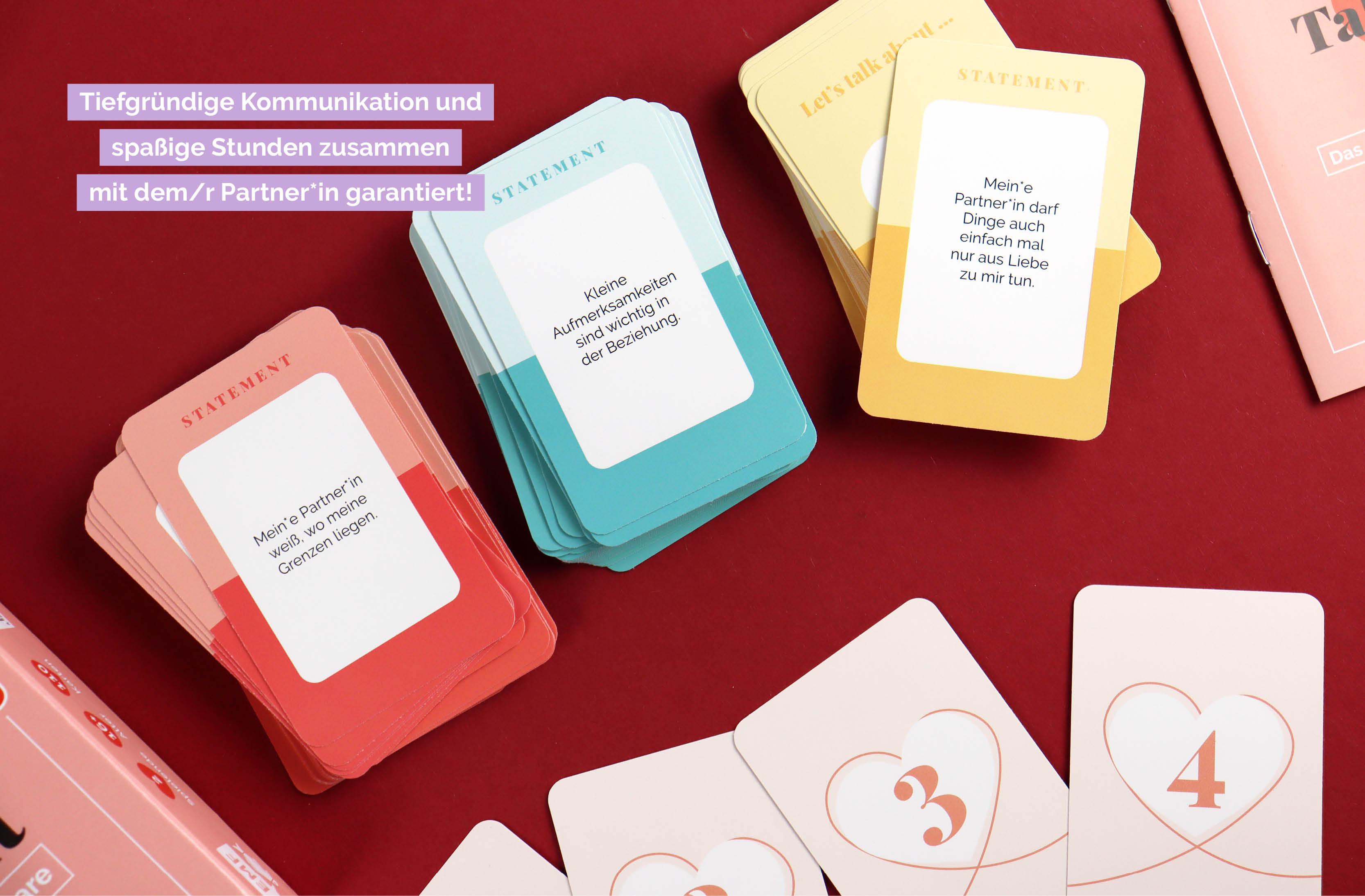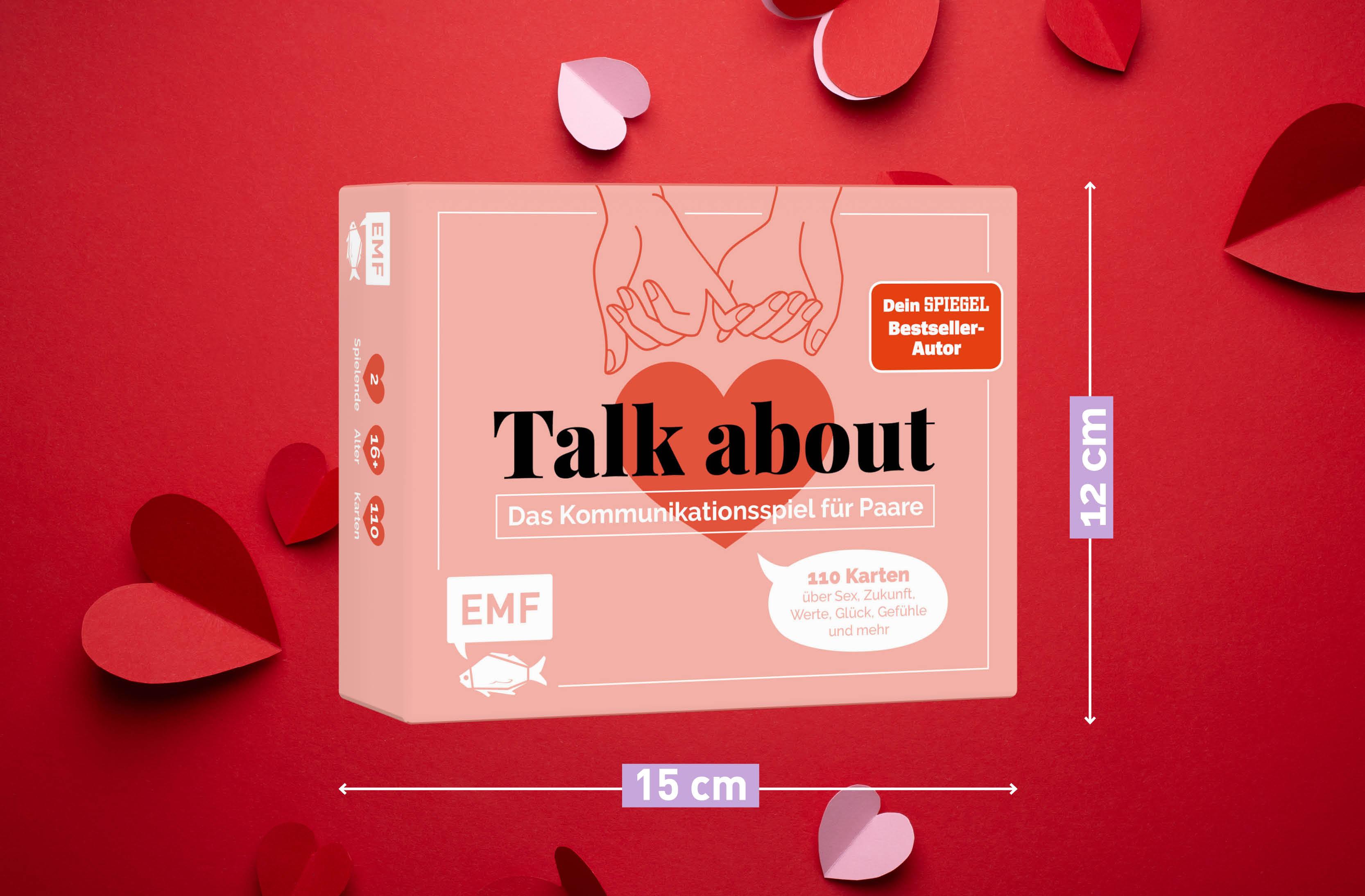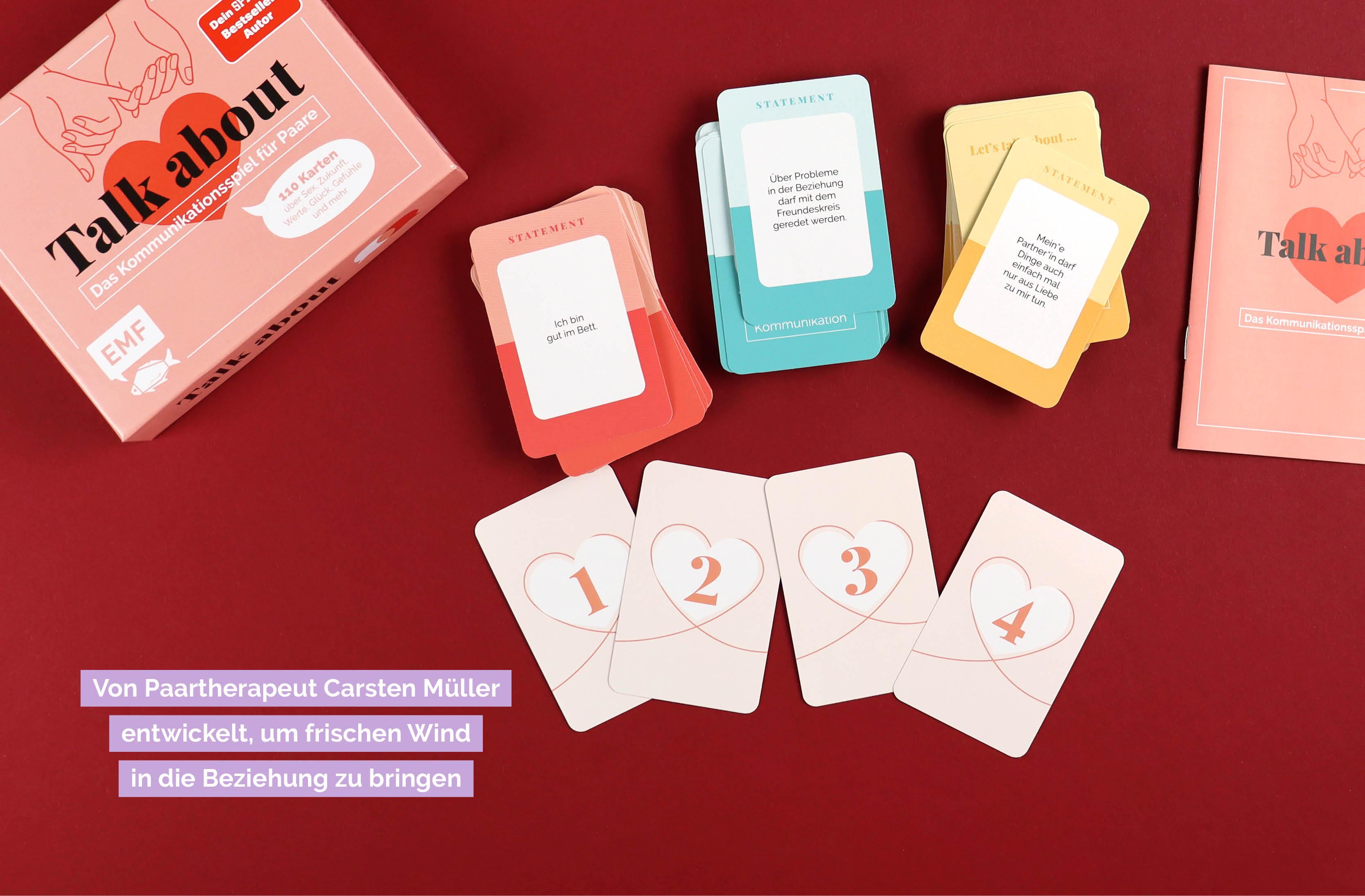 Deep Talk statt Small Talk ist bei dieser Kartenbox angesagt. Der erfahrene Paar- und Sexualtherapeut Carsten Müller hat für den Alltag von Paaren ein Kartenspiel entwickelt, das Spaß, Tiefgang und bestimmt die ein oder andere Überraschung für Frischverliebte, Langvergebene und alle dazwischen bereithält.Ob zur Hochzeit, zum Jahrestag oder einfach zwischendurch - schenkt euch Paarzeit, die ganz easy zu Hause stattfinden kann und nicht als aufwendiges Date im schicken Restaurant oder zum x-ten Mal im Kino stattfinden muss. Paar- und Sexualtherapeut Carsten Müller weiß, wie man frischen Wind in die Beziehung bringt, und hat basierend auf seinen Praxiserfahrungen ein überraschendes Spiel entwickelt, das genau die richtige Mischung aus Tiefgang und Spaß mitbringt. Alles, was ihr braucht, sind 30 Minuten Zeit (gerne auch länger) und die Abwesenheit von allen störenden Geräten und Ablenkungen. Paarzeit pur.Reden, reden, reden - wird garantiert nicht überbewertet und mit diesem Kommunikationsspiel kinderleicht. Die Box enthält eine gut verständliche Anleitung und 110 handliche Karten. Die Spiel-Idee: