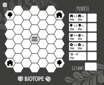 Eine_r würfelt und alle sind gleichzeitig dran! Doch wer platziert die Symbole am geschicktesten und gewinnt das Spiel? Die Regeln sind schnell erklärt, der Spielspaß kann sofort beginnen! Punkte gibt es für das beste Ökosystem, aber pass auf, dass du dir keine Lücken einbaust! Ein Würfelspiel, für das es Taktik braucht - und das berühmte Quäntchen Glück!