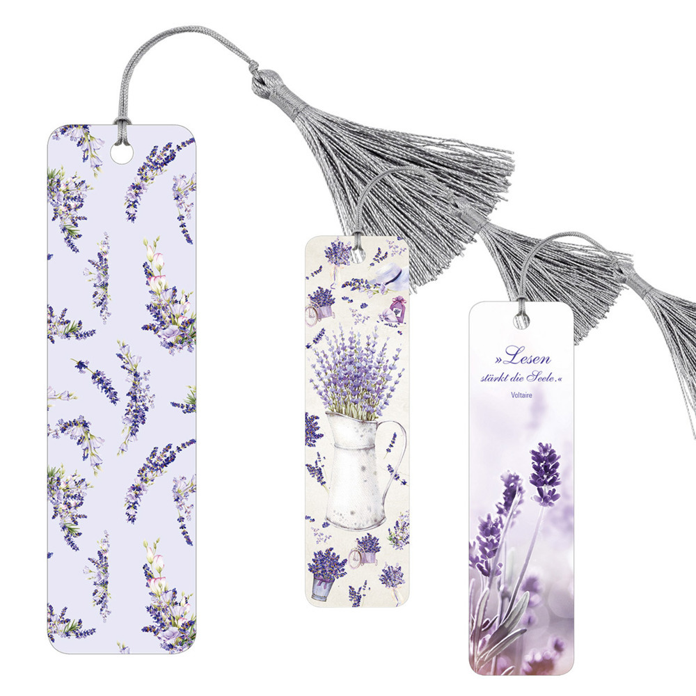 eit umso größer. (3 Lesezeichen mit unterschiedlichen Motiven, je 4,5 x 16 cm, mit Lavendelduft-Spot, mit Quaste, Länge 15 cm, im Polybag)- elegante Lesezeichen mit dezentem Lavendelduftspots- mit drei verschiedenen Lavendel-Motiven und Voltaire-Zitat- mit silbernen Quasten