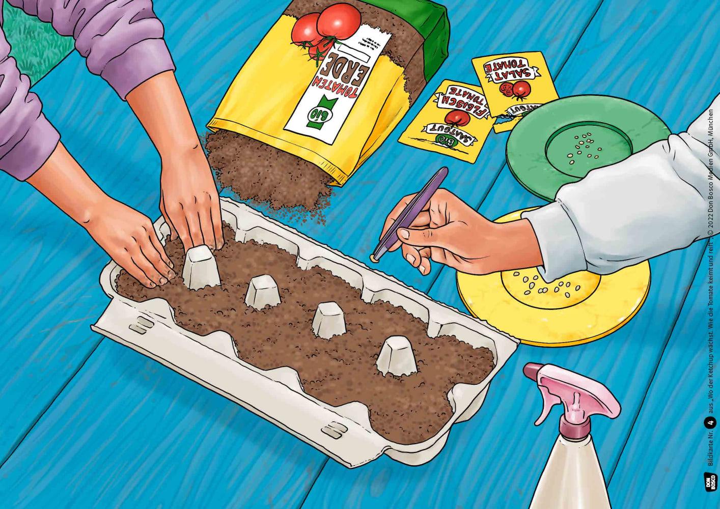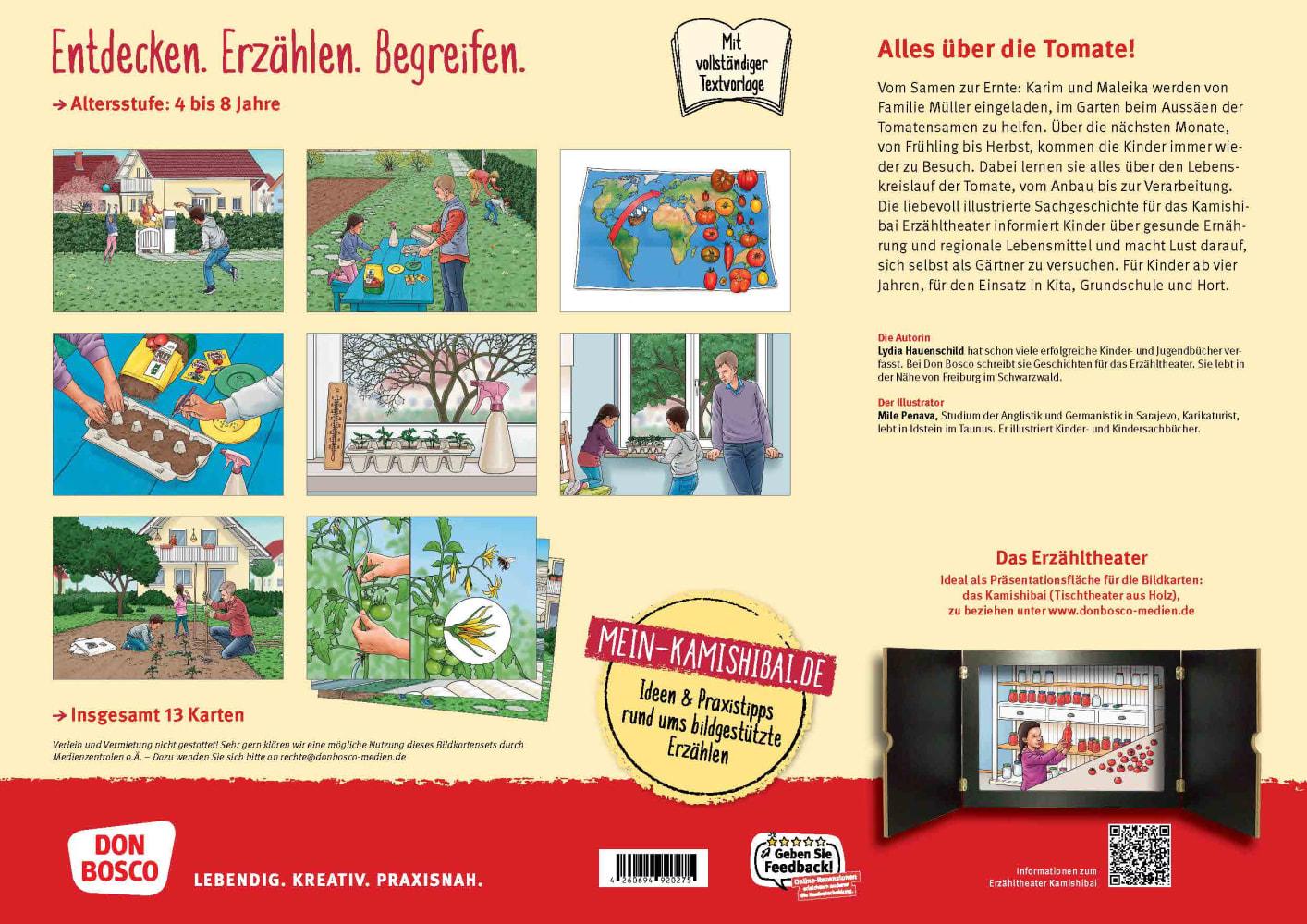 Vom Samen zur Ernte: Eine Sachgeschichte für das Erzähltheater Karim und Maleika werden von Familie Müller eingeladen, im Garten beim Aussäen der Tomatensamen zu helfen. Über die nächsten Monate, von Frühling bis Herbst, kommen die Kinder immer wieder auf Besuch. Dabei lernen sie alles über den Lebenskreislauf der Tomate.Mit diesem Bildkarten-Set für das Kamishibai entdecken Kinder, was alles getan werden muss, bis sie ihren Ketchup genießen können. In kurzen Erzähleinheiten begleiten sie Karim und Maleika Schritt für Schritt bei den vielen Arbeiten, die dafür notwendig sind: Gärtnern mit Kindern: Naturwissen vermitteln mit dem Kamishibai Mit dem Kamishibai-Theater erleben die Kinder die Geschichten mit allen Sinnen und werden zum Zuhören und Mitmachen animiert. Die Bildkarten, die während des Erzählens nacheinander präsentiert werden, zeigen die vielen Schritte von unscheinbaren Samen bis zu köstlichen Tomaten aus dem eigenen Garten. Dabei machen die zu den Abbildungen passenden Fragen Lust darauf, sich selbst als Gärtner zu versuchen. Die Themen gesunde Ernährung und umweltbewusstes Einkaufen bieten sich im Anschluss an den Vortrag als weiterführende Diskussionspunkte an.Mit dieser Geschichte für das Erzähltheater vermitteln Sie Kindern Spaß am Gemüse anbauen und Kenntnisse über die Herkunft regionaler Lebensmittel!