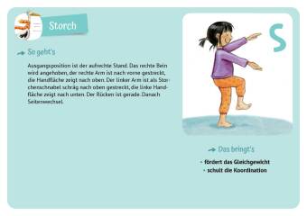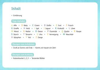 r Ruhe zu kommen. Hier helfen die Kinderyoga-Haltungen! Die Illustrationen unterstützen kleine Yogis dabei, sich das Aussehen der Asanas einzuprägen. Affe, Baby, Clown - für jeden der 26 Buchstaben des Alphabets enthält das Kartenset einen Begriff, der mit dem jeweiligen Buchstaben beginnt. So entspannen die Yoga-Übungen nicht nur, sondern können auch als spielerischer Einstieg in das Erlernen des ABCs dienen.