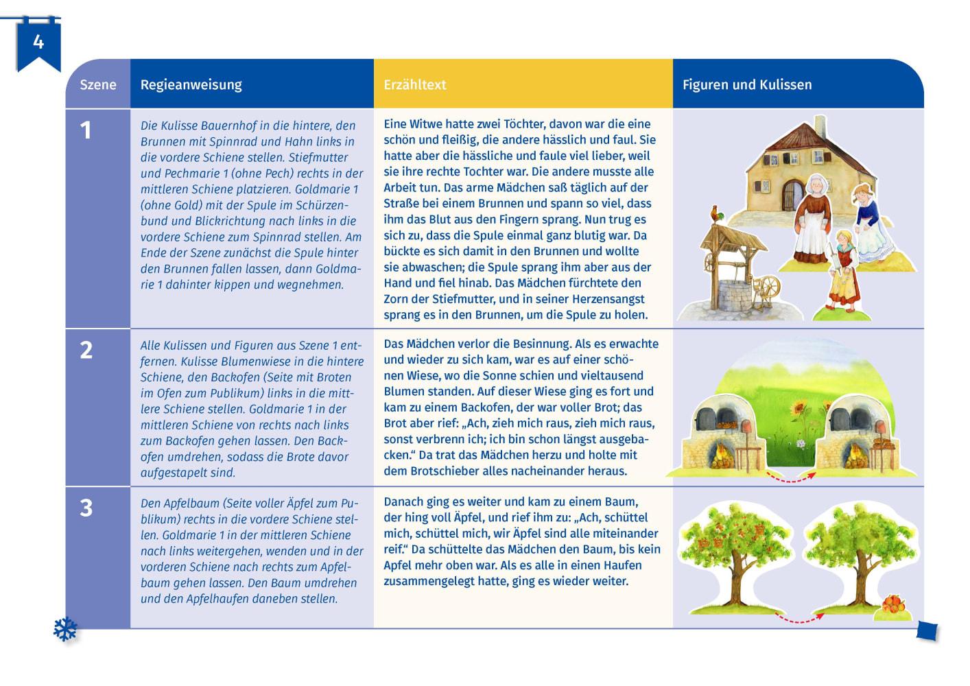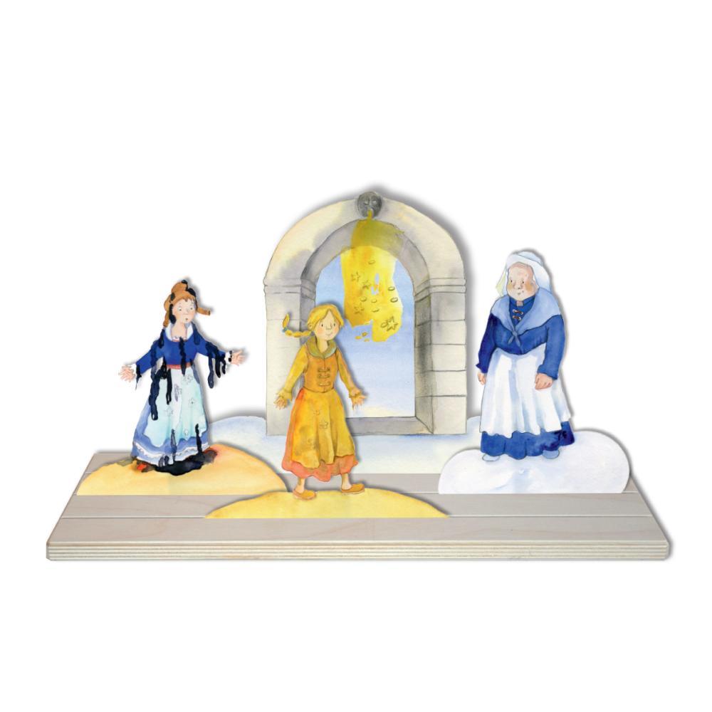 Goldmarie und Pechmarie bei Frau Holle: ein Wintermärchen für die Erzählschiene Als dem Mädchen beim Spinnen die Spule in den Brunnen fällt, springt es aus Angst vor der strengen Stiefmutter hinterher. Es erwacht im Land von Frau Holle, die das Mädchen zum Mithelfen auffordert: Das Federbett muss kräftig geschüttelt werden, damit es auf der Erde schneit! Zum Abschied wird der Fleiß des Mädchens reich belohnt. Beladen mit Gold kehrt es zum Hof der Stiefmutter zurück, die daraufhin ihrer leiblichen Tochter das gleiche Glück bescheren möchte. Den bekannten Märchen-Klassiker der Brüder Grimm gibt es jetzt auch für die Erzählschiene. Die Illustrationen von Petra Lefin setzen Goldmarie und Pechmarie vor zauberhaften Kulissen wunderbar in Szene. So erwecken die Erzählschiene-Figuren das Frau Holle-Märchen in Kita und Grundschule zum Leben!