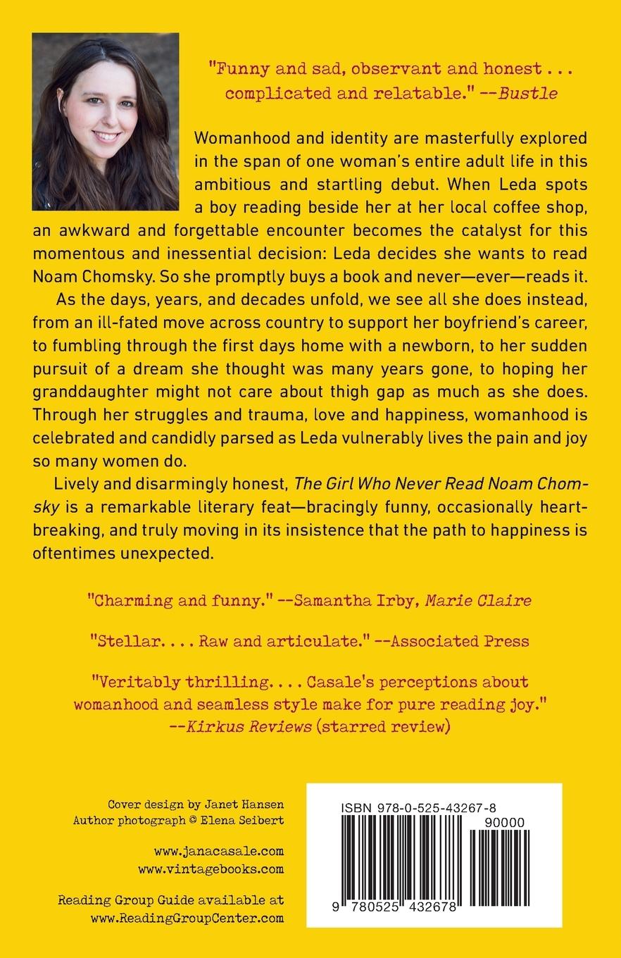 Kirkus Reviews, "11 Debuts You Need to Pay Attention To"HelloGiggles, "Books you don't want to miss"Bustle, "Books you need to know"An ambitious debut, at once timely and timeless, that captures the complexity and joys of modern womanhood. This novel is gem like-in its precision, its many facets, and its containing multitudes. Following in the footsteps of Virginia Woolf, Rona Jaffe, Maggie Shipstead, and Sheila Heti, Jana Casale writes with bold assurance about the female experience. We first meet Leda in a coffee shop on an average afternoon, notable only for the fact that it's the single occasion in her life when she will eat two scones in one day. And for the cute boy reading American Power and the New Mandarins. Leda hopes that, by engaging him, their banter will lead to romance. Their fleeting, awkward exchange stalls before flirtation blooms. But Leda's left with one imperative thought: she decides she wants to read Noam Chomsky. So she promptly buys a book and never-ever-reads it. As the days, years, and decades of the rest of her life unfold, we see all of the things Leda does instead, from eating leftover spaghetti in her college apartment, to fumbling through the first days home with her newborn daughter, to attempting (and nearly failing) to garden in her old age. In a collage of these small moments, we see the work-both visible and invisible-of a woman trying to carve out a life of meaning. Over the course of her experiences Leda comes to the universal revelation that the best-laid-plans are not always the path to utter fulfillment and contentment, and in reality there might be no such thing. Lively and disarmingly honest, The Girl Who Never Read Noam Chomsky is a remarkable literary feat-bracingly funny, sometimes heartbreaking, and truly feminist in its insistence that the story it tells is an essential one.