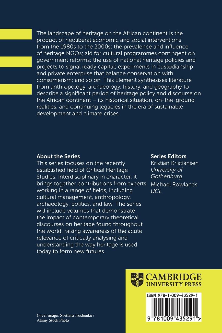 This Element synthesises literature from anthropology, archaeology, history, and geography to describe a significant period of heritage policy and discourse on the African continent - its historical situation, on-the-ground realities, and continuing legacies in the era of sustainable development and climate crises.