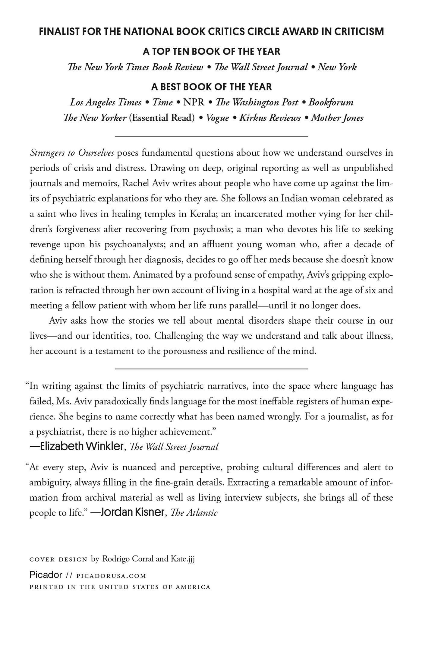 One of the top ten books of the year at The New York Times Book Review, The Wall Street Journal, Vulture/New York magazineA best book of the year at Los Angeles Times, Time, NPR, The Washington Post, Bookforum, The New Yorker, Vogue, KirkusThe acclaimed, award-winning New Yorker writer Rachel Aviv offers a groundbreaking exploration of mental illness and the mind, and illuminates the startling connections between diagnosis and identity.Strangers to Ourselves poses fundamental questions about how we understand ourselves in periods of crisis and distress. Drawing on deep, original reporting as well as unpublished journals and memoirs, Rachel Aviv writes about people who have come up against the limits of psychiatric explanations for who they are. She follows an Indian woman celebrated as a saint who lives in healing temples in Kerala; an incarcerated mother vying for her children's forgiveness after recovering from psychosis; a man who devotes his life to seeking revenge upon his psychoanalysts; and an affluent young woman who, after a decade of defining herself through her diagnosis, decides to go off her meds because she doesn't know who she is without them. Animated by a profound sense of empathy, Aviv's gripping exploration is refracted through her own account of living in a hospital ward at the age of six and meeting a fellow patient with whom her life runs parallel-until it no longer does.Aviv asks how the stories we tell about mental disorders shape their course in our lives-and our identities, too. Challenging the way we understand and talk about illness, her account is a testament to the porousness and resilience of the mind.