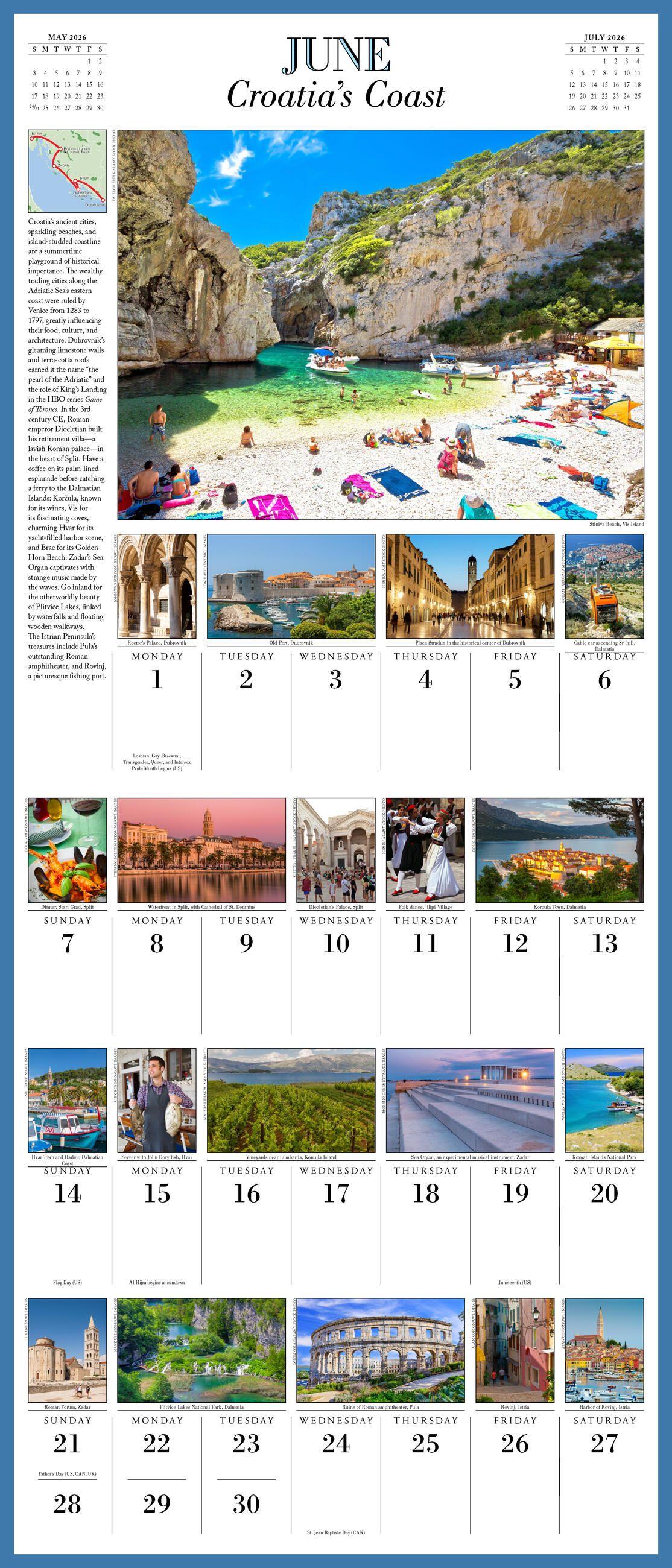 AN ITINERARY IN PHOTOS: Each monthly spread includes dozens of full-color images accompanied by engaging text packed with history, highlights, maps, and traveler's tips.BUCKET LIST DESTINATIONS: Visit some of the world's most beautiful places without going anywhere.AMAZING GIFT: Travel obsessives will love the 12" x 14" picture-a-day format, with more photography and content in every month.NOW PLASTIC-FREE!: Workman wall calendars are completely plastic-free! Now printed with an extended paper flap closed with a fully recyclable seal-no more shrink-wrap!