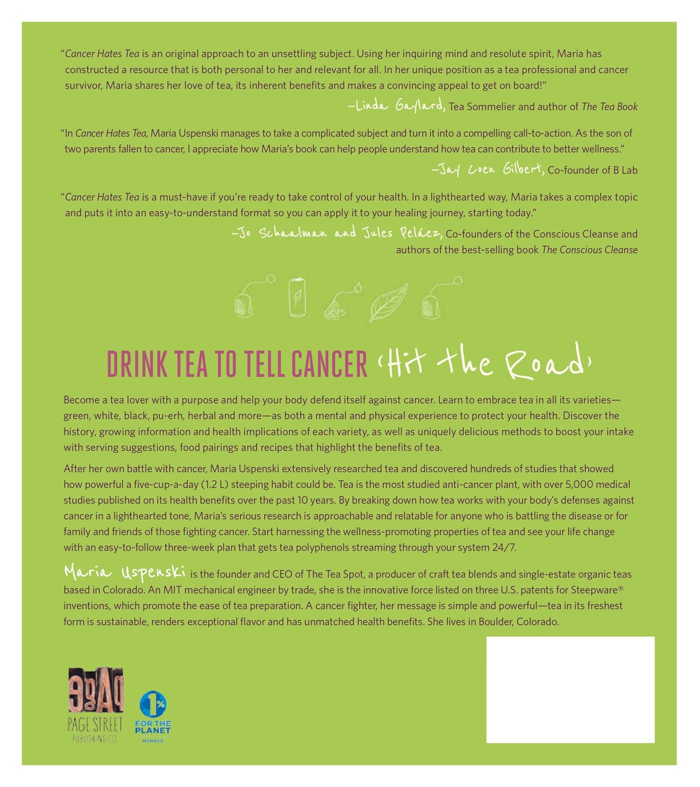 Drink Tea to Tell Cancer 'Hit the Road' Become a tea lover with a purpose and help your body defend itself against cancer. Learn to embrace tea in all its varieties- green, white, black, pu-erh, herbal and more-as both a mental and physical experience to protect your health. Discover the history, growing information and health implications of each variety, as well as uniquely delicious methods to boost your intake with serving suggestions, food pairings and recipes that highlight the benefits of tea. After her own battle with cancer, Maria Uspenski extensively researched tea and discovered hundreds of studies that showed how powerful a five-cup-a-day (1.2 L) steeping habit could be. Tea is the most studied anti-cancer plant, with over 5,000 medical studies published on its health benefits over the past 10 years. By breaking down how tea works with your body's defenses against cancer in a lighthearted tone, Maria's serious research is approachable and relatable for anyone who is battling the disease or for family and friends of those fighting cancer. Start harnessing the wellness-promoting properties of tea and see your life change with an easy-to-follow three-week plan that gets tea polyphenols streaming through your system 24/7.