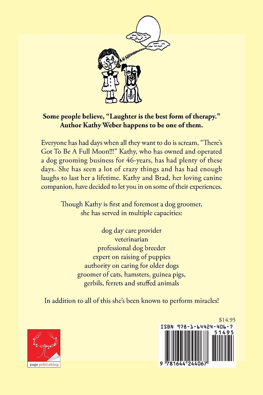 Some people believe, "Laughter is the best form of therapy." Author Kathy Weber happens to be one of them. Everyone has had days when all they want to do is scream, "There's Got To Be A Full Moon!!!" Kathy, who has owned and operated a dog grooming business for 46-years, has had plenty of these days. She has seen a lot of crazy things and has had enough laughs to last her a lifetime. Kathy and Brad, her loving canine companion, have decided to let you in on some of their experiences. Though Kathy is first and foremost a dog groomer, she has served in multiple capacities: dog day care provider veterinarian professional dog breeder expert on raising of puppies authority on caring for older dogs groomer of cats, hamsters, guinea pigs, gerbils, ferrets and stuffed animals In addition to all of this she's been known to perform miracles!