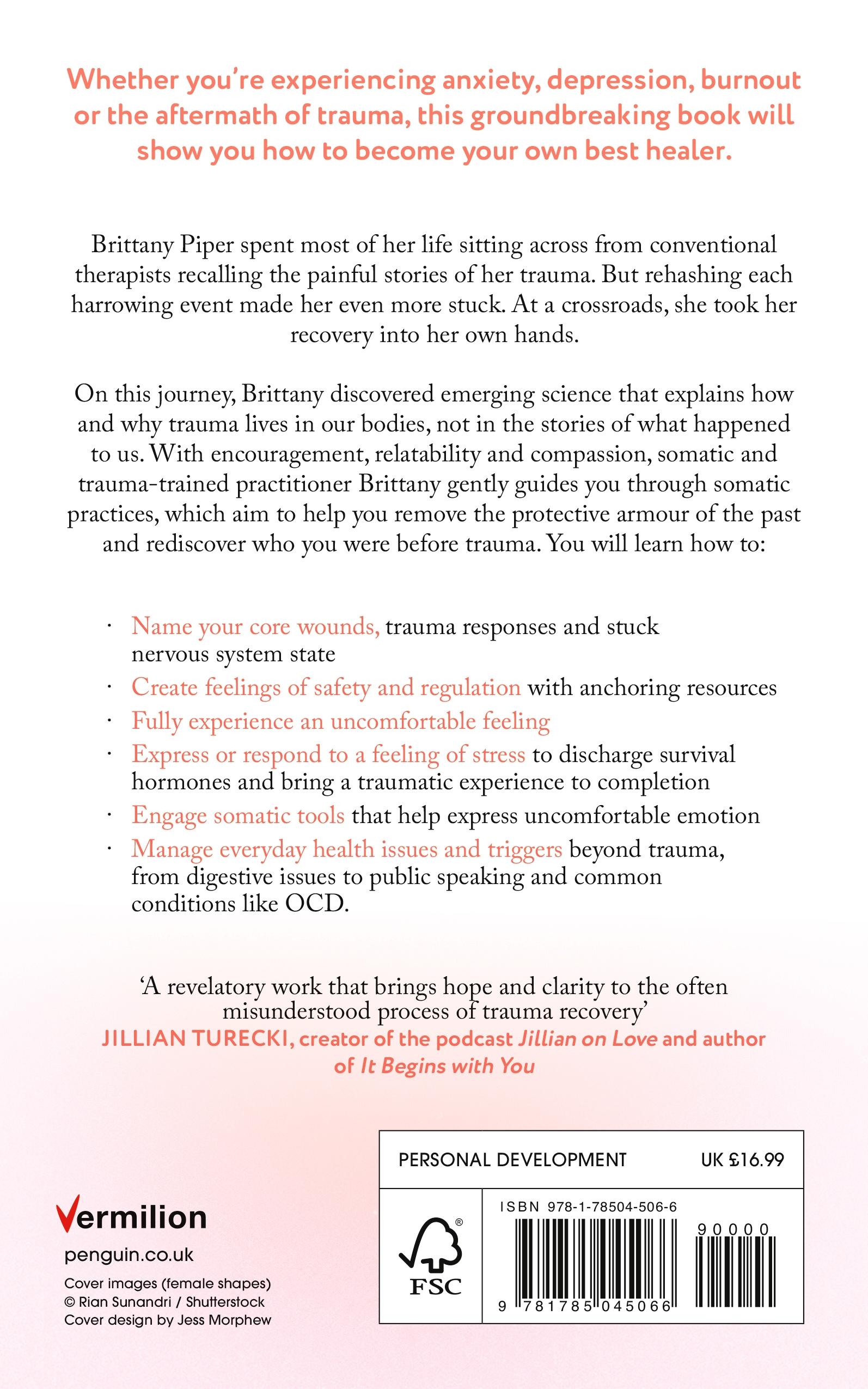 Whether you're experiencing anxiety, depression, burnout, or the aftermath of trauma, this groundbreaking book will show you how to become your own best healer. Brittany spent most of her life sitting across from therapists recalling the painful stories of her trauma. But rehashing each event - being put into foster care as a baby, losing her brother in a car accident, enduring a brutal rape and a public trial, and more - made her even more stuck. At a crossroads, she took her recovery into her own hands. On this journey, Brittany discovered science that explains how and why trauma lives in our bodies, not in the story of what happened to us. Trauma overwhelms our nervous system, which operates through feelings, sensations, and emotions, not through words and thoughts. Now a Somatic practitioner herself, in Body-First Healing Brittany provides a roadmap to recovery, resilience, and nervous system regulation. With Brittany, you will learn how to:Name your core wounds, trauma responses, and stuck nervous system stateCreate feelings of safety and regulation with anchoring resources like exploratory orienting, movement, self-contact, etc. Fully experience an uncomfortable feeling with the Sensation, Image, Behaviour, Affect, Meaning frameworkEngage somatic tools, like air screaming for anger or limb shaking for anxiety, that help express uncomfortable emotion