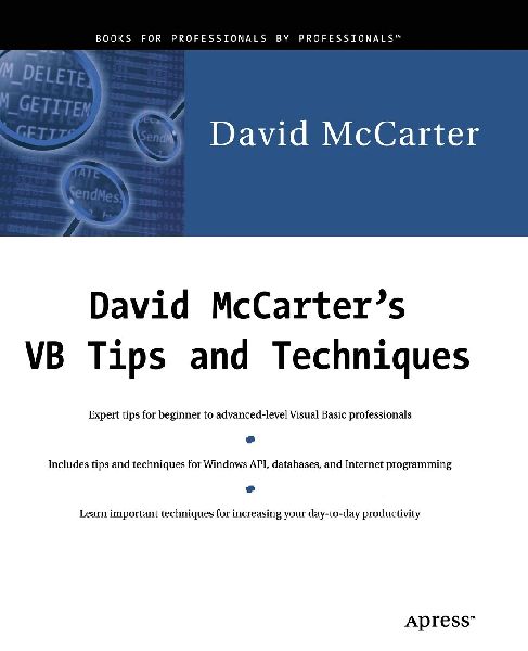 In his new book, veteran Visual Basic programmer David McCarter provides VB professionals with a variety of important new tips and techniques designed to maximize day-to-day productivity. Those who enjoyed David's first book, VB Tips and Tricks, will find the author's familiar style paired with content of special interest to intermediate and advanced developers.