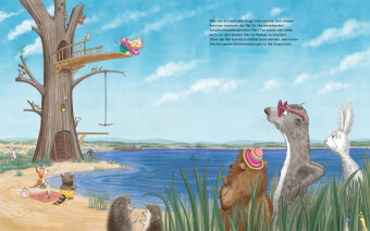 Es ist ein herrlicher Sommertag am See und Schwein ist bereit: Es hat seinen Schwimmreif, seine Schwimmflügel und jede Menge gute Laune. Als es auf den See zustapft, schauen sich die anderen Tiere besorgt an. Weiß Schwein denn nicht, dass Bär jeden Tag für die Schwimmmeisterschaft trainiert und richtig böse werden kann, wenn man in seinem See planscht?