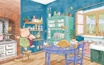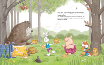 Da kommt er an Schweins Haus vorbei und dort duftet es ganz gewaltig lecker. Mmh, einen riesigen Stapel Pfannkuchen hat Schwein unbeaufsichtigt zurückgelassen. Ein Grinsen stiehlt sich auf Bärs Gesicht ...