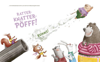 Beim Versteckspielen bleibt Schwein in einem Baumstamm stecken. Die Tiere versuchen vergeblich, das festsitzende Schwein zu befreien. Selbst Bär mit seiner Bärenstärke kann nicht helfen. Da hat Schwein eine Idee: die Erbsensuppe vom Vorabend muss her.