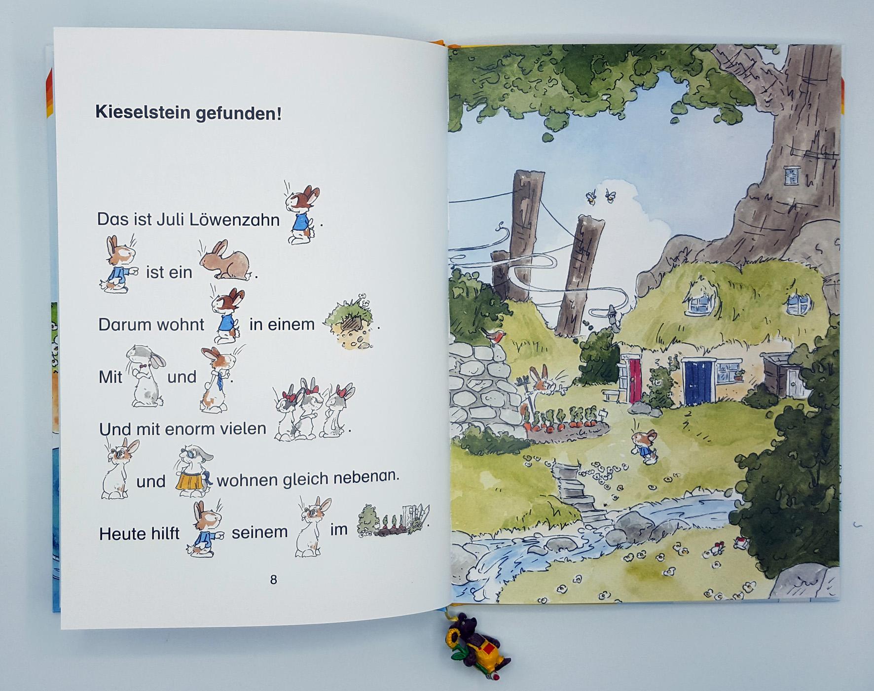 So ein schöner Kieselstein! Aber er liegt mitten im Bach, für Juli Löwenzahn unerreichbar. Doch mit Opas Hilfe erwischt er ihn. Da lauert schon ein neues Abenteuer: Mit seinem besten Freund, der Schildkröte Günther, lässt Juli Schiffchen auf dem Bach fahren. Dabei kommen sie an einen tollen Teich - den allerbesten Platz zum Baden und Zelten! Und so startet gleich das nächste Abenteuer.