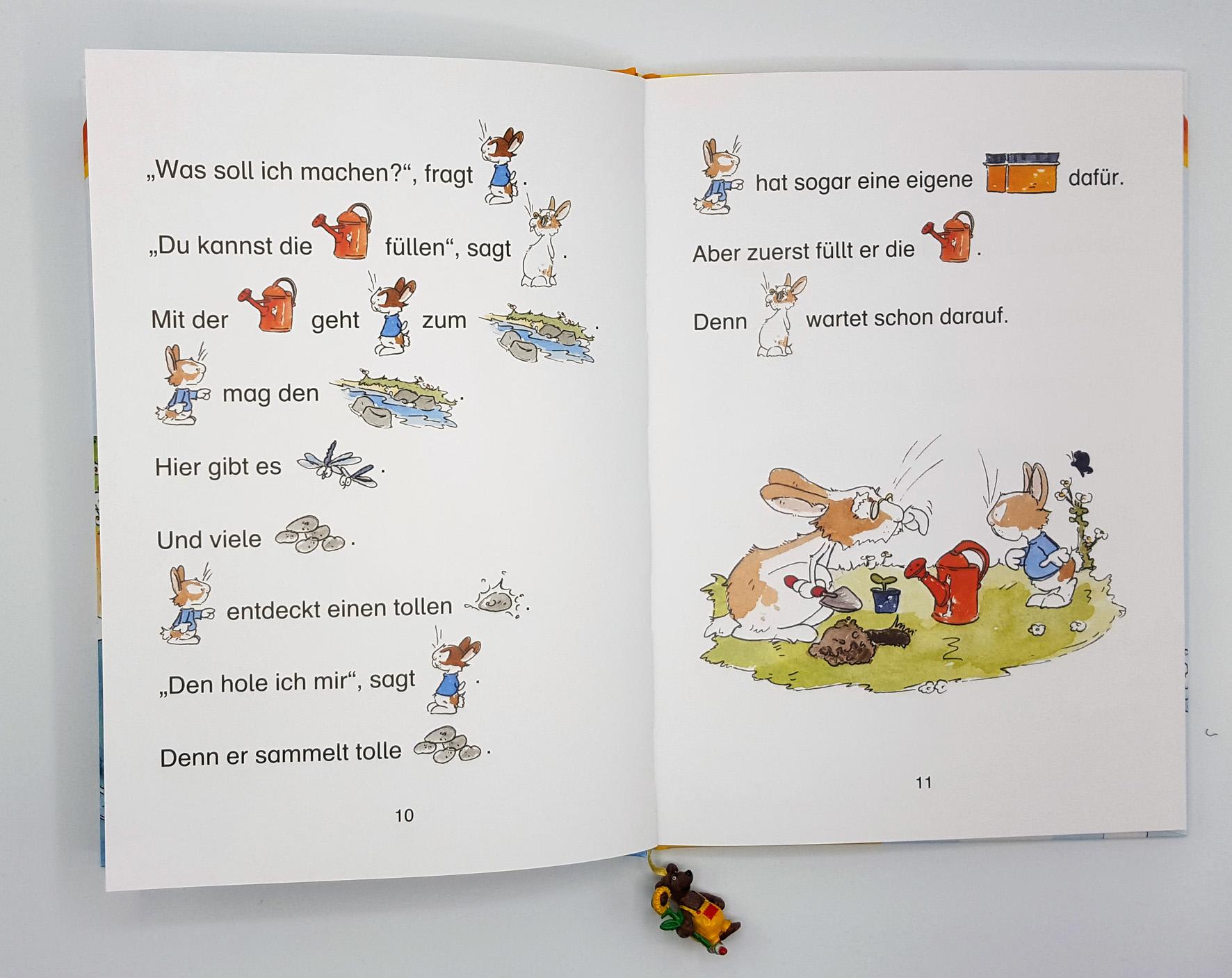 Die Namenwörter wurden durch Bilder ersetzt, wodurch auch Kinder "Mitlesen" können, die das Abc noch nicht gelernt haben. Das macht neugierig und Lust auf mehr. Zusätzlich regen Rätsel am Ende des Buchs zum Gespräch über die Geschichte an. Denn Kinder, die viel Gelegenheit zum Sprechen haben, lernen auch schneller lesen.