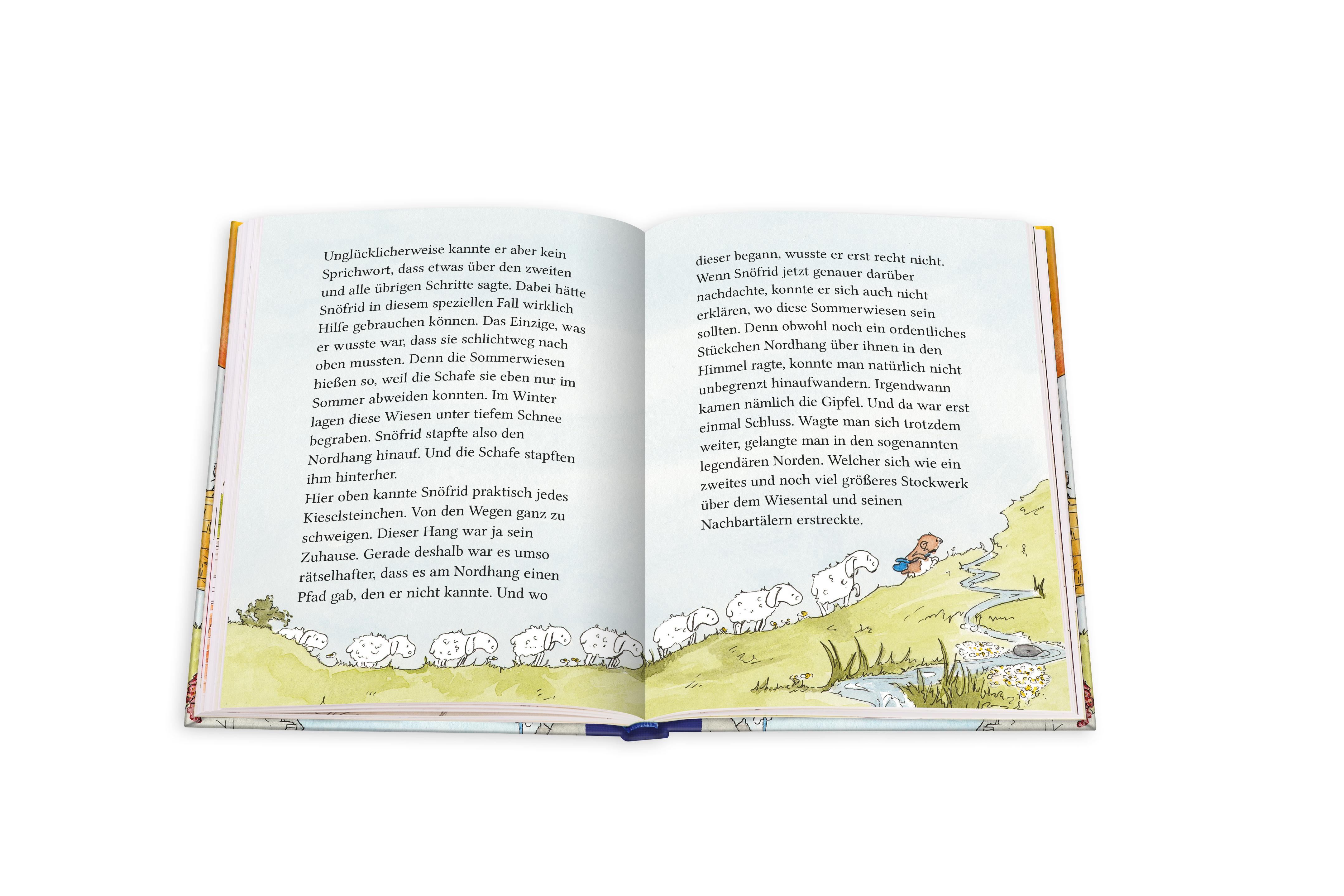 Snöfrid staunt nicht schlecht, als eines Morgens die Schafe des gesamten Nordhangs vor seinem Heim auftauchen. Sie bitten den Nordlandretter um heldenhaften Beistand. Denn Runkord, ihr Hirte, ist spurlos verschwunden, und es ist längst Zeit für den Umzug auf die Sommerwiesen! Auf der Suche nach dem uralten, traditionsreichen Pfad erleben Snöfrid und Björn ihr blaues Wunder. Und das nicht zuletzt im Flug mit einem wahrlich abenteuerlichen Luftschiff.
