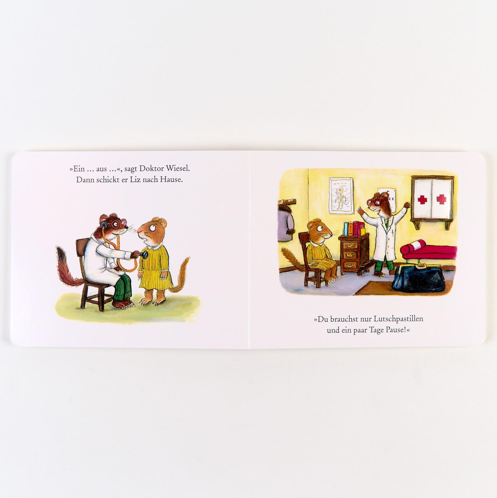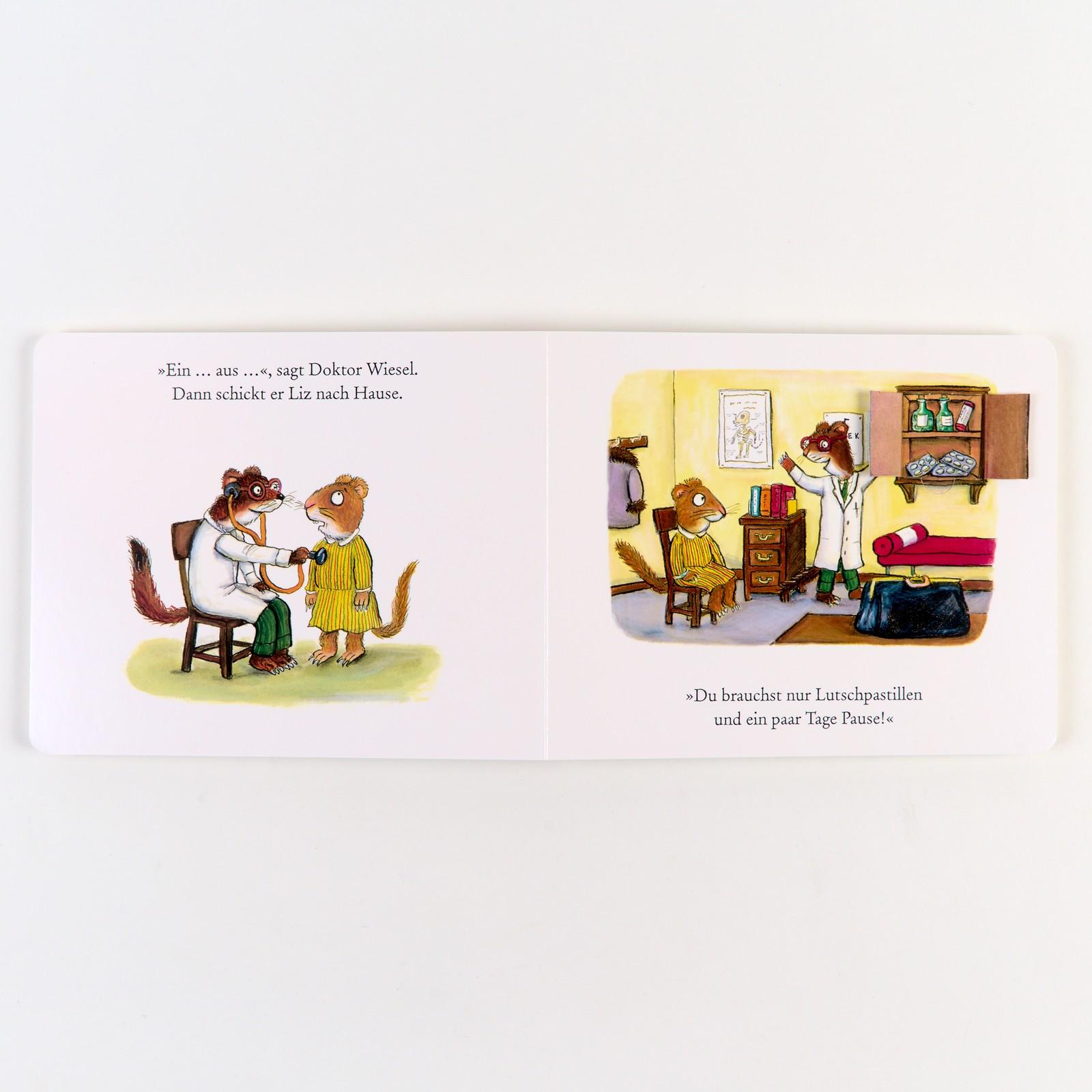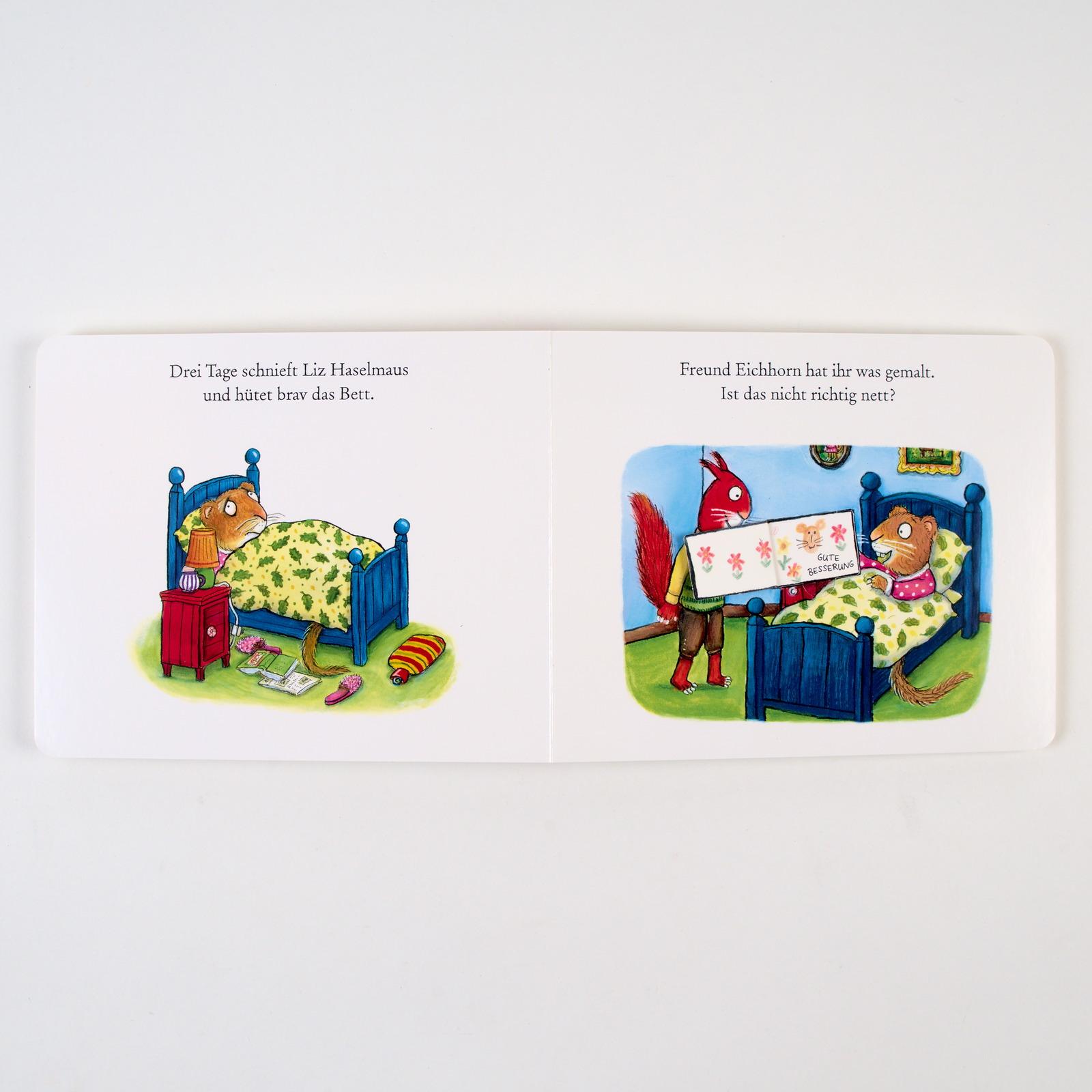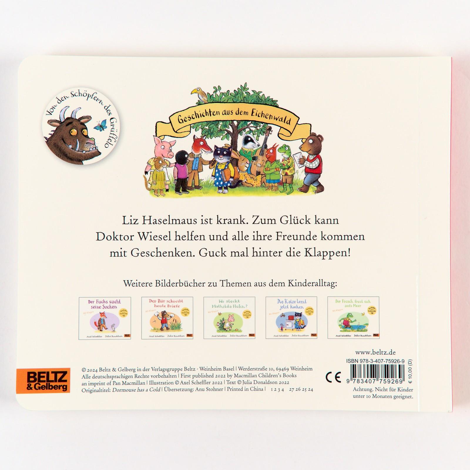 Liz Haselmaus ist krank - die Nase läuft, es kratzt im Hals. Zum Glück helfen die Lutschpastillen von Doktor Wiesel. Aber am Schönsten ist es, wenn alle ihre Freunde sie besuchen. Das Eichhörnchen malt ein Bild, die Amsel kommt mit Trauben. Und was bringen Fuchs und Maulwurf mit? Beim Öffnen der Klappen findet man alle Geschenke!Ein Pappbilderbuch von den Schöpfern des Grüffelo mit vielen Klappen für neugierige Kinder, die begeistert beim Suchen helfen können. Mit bunten Bildern und lustigen Reimen, mit denen Vorlesen großen Spaß macht.In allen Bilderbüchern aus der Reihe »Geschichten aus dem Eichenwald« geht es um Themen aus dem Kinderalltag. In diesem Buch geht es um Erkältung, Kranksein, gute Besserung und das Schönste - netter Krankenbesuch.Weitere Geschichten aus dem Eichenwald:. Der Fuchs sucht seine Socken. Wo steckt Mathilda Huhn?. Die Katze lernt jetzt kochen. Evi Eichhorns Schneemann. Der Bär schreibt heute Briefe. Wo ist die Brille von Max Maulwurf?. Der Dachs spielt super Kontrabass