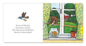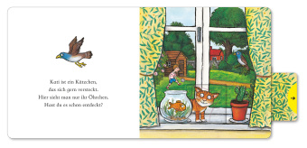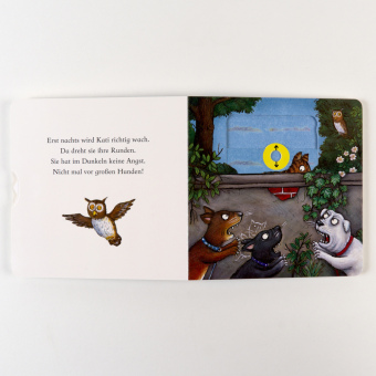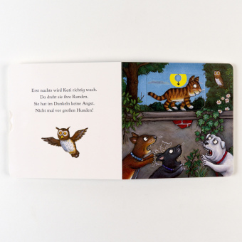 Kati, das Kätzchen ist bei Tag gern zu Haus und ruht sich aus, nachts wird sie wach und dreht ihre Runden und hat nicht mal Angst vor Hunden.Eine vergnügliches Pappbilderbuch von dem Illustrator des Grüffelo mit einfachen und lustigen Versen, in denen kleine Kinder mit dem kleinen Kätzchen miauen können. Mit je vier Elementen zum Schieben und Ziehen.