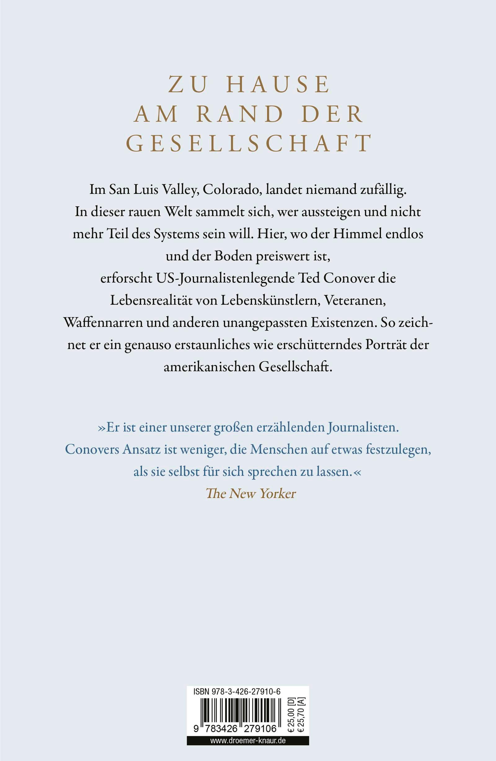 Zwischen Zivilisation und Niemandsland - eine herausragende Reportage von der letzten Frontier der USA Die meisten Amerikanerinnen und Amerikaner haben noch nie vom San Luis Valley gehört: einer flachen, weiten Prärielandschaft mitten im Nirgendwo. Das riesige Gebiet ist nicht erschlossen, trotzdem leben hier Menschen ihren Traum vom eigenen Landbesitz - und von einem besseren Leben. Wer sind die Männer und Frauen, die verstreut in Wohnwagen leben, sich ihren Lebensunterhalt mit Marihuana-Anbau oder Goldschürfen verdienen? Und was können sie uns über Amerika erzählen? Ted Conover gilt als einer der größten Journalisten seiner Generation . Über Jahre hinweg lernt er die Bewohner der sogenannten Flats immer besser kennen. Er trifft Veteranen, Kriminelle, Waffen-Liebhaber und religiöse Fundamentalisten. Prepper, Trump-Jünger und Verschwörungstheoretiker. Aber er macht auch die Bekanntschaft von intakten Familien, erlebt Gastfreundschaft und immer wieder ein starkes Gemeinschaftsgefühl. Meisterhaft taucht Ted Conover in seinem neuen Buch in das Leben dieser Einsiedler ein - und kehrt mit einem unvergesslichen Porträt eines vergessenen Teils der heutigen amerikanischen Gesellschaft zurück. So gelingt ihm nicht weniger als ein atmosphärisches dichtes Stimmungsbild einer gespaltenen Nation. »Einer unserer großen erzählenden Journalisten.« The New York Times »Mit seiner gründlichen und einfühlsamen Reportage beschwört Conover eine lebendige, geheimnisvolle Subkultur herauf, die von Männern und Frauen bevölkert wird, die fesselnde Geschichten zu erzählen haben.« The Washington Post
