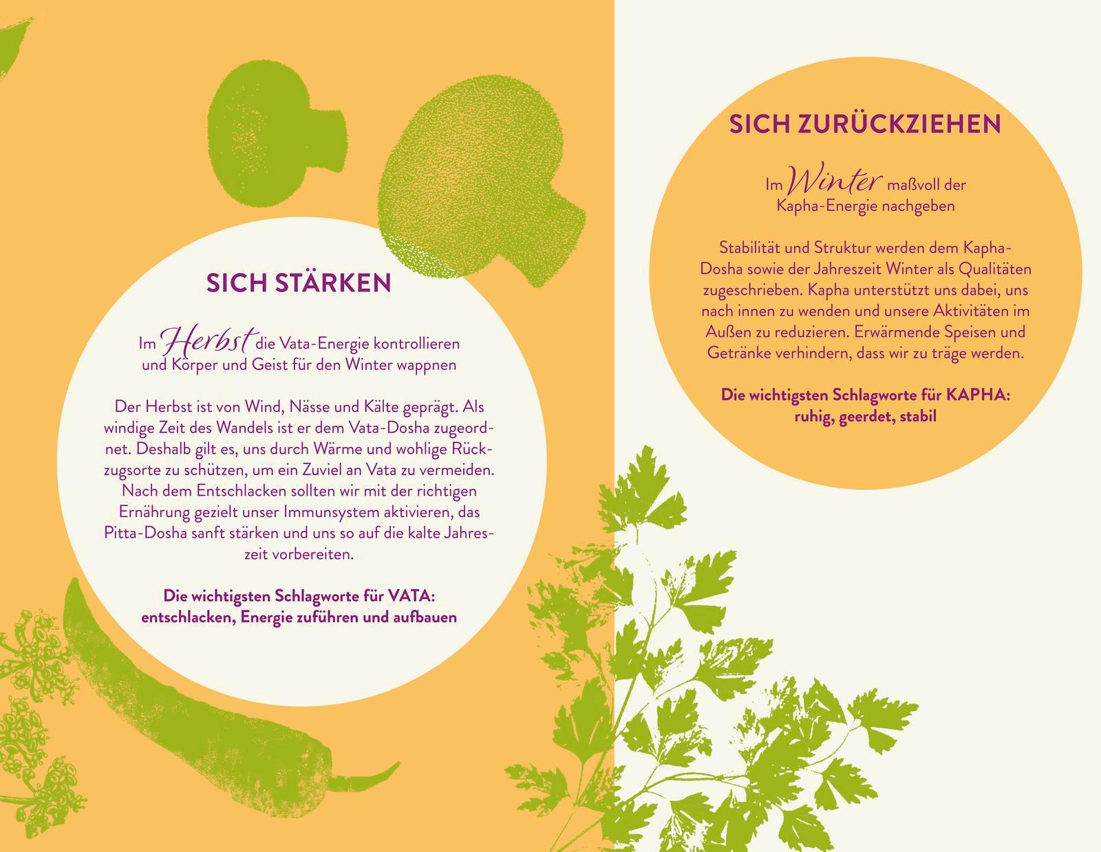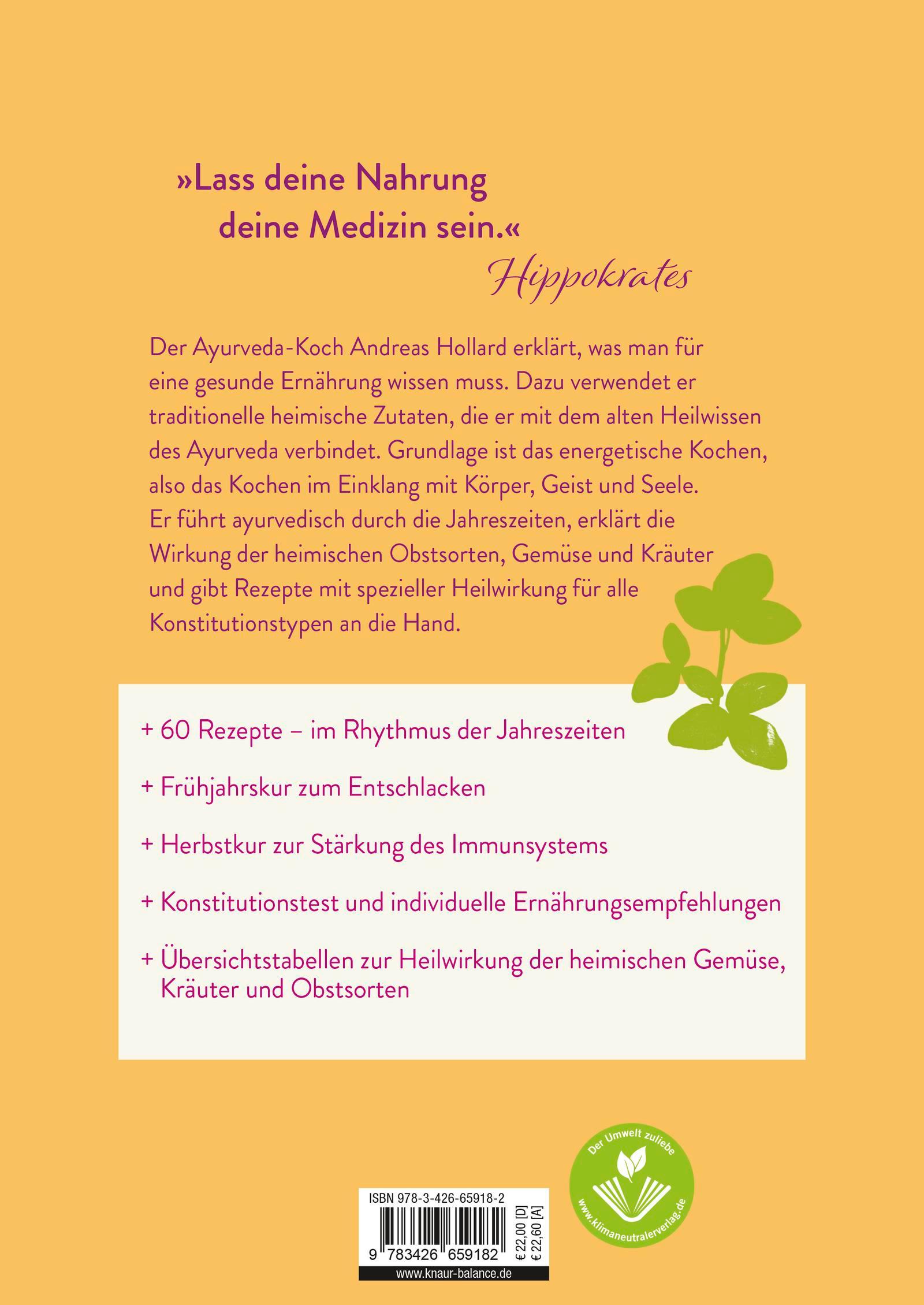 Gesundheitsratgeber über die Heilwirkung der Ayurveda-Ernährung mit heimischen Zutaten, mit Selbsttest und insgesamt ca. 60 Rezepten für alle Konstitutionstypen.»Ayurvedische Ernährung muss nicht kompliziert sein und kann viel Freude beim Kochen und Essen bereiten« ist die Auffassung des Ayurveda-Kochs Andreas Hollard. In seinem Gesundheitsratgeber erklärt er zunächst alles, was man für eine gesunde Ernährung nach Ayurveda wissen muss. Dazu gehören neben dem Erkennen der eigenen Konstitution mit einem Test auch Basics wie der Umgang mit Gewürzen sowie die richtige Reihenfolge beim Kochen, Verwendung von heimischen Kräutern in der Küche, Ernährungstipps und vieles mehr. Grundlage ist das energetische Kochen, also das Kochen im Einklang mit Körper, Geist und Seele.Im Hauptteil des Buches führt er durch die Jahreszeiten, erklärt die spezifische ayurvedische Wirkung der heimischen Gemüse, Kräuter und Obstsorten. Tabellen geben einen schnellen Überblick über deren ayurvedische Heileigenschaften. Spezielle Kuren sind auf die Energien der Jahreszeiten abgestimmt, im Frühjahr gibt es eine Detox-Kur und im Herbst eine Kur zur Stärkung des Immunsystems. Ebenso finden sich, den Jahreszeiten zugeordnet, ayurvedische Rezepte mit speziellen Heilwirkungen, die für verschiedene Konstitutionstypen individuell angepasst werden. So kann man auch in der Familie für alle ayurvedisch gesund kochen.