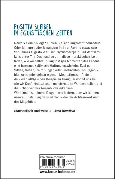 Ein Leitfaden, wie man in egoistischen Zeiten überlebt.Der Psychotherapeut und Achtsamkeitslehrer Tim Desmond zeigt, wie wir selbst in ungünstigen Momenten des Lebens eine humane, kultivierte Haltung bewahren. Nervt Sie ein Kollege? Fühlen Sie sich ungerecht behandelt? Oder ist Ihnen oder jemandem in Ihrer Familie etwas sehr Schlimmes zugestoßen?Schlimme Dinge können wir nicht ändern, aber wir können unsere Einstellung dazu wählen - die der Achtsamkeit und des Mitgefühls.