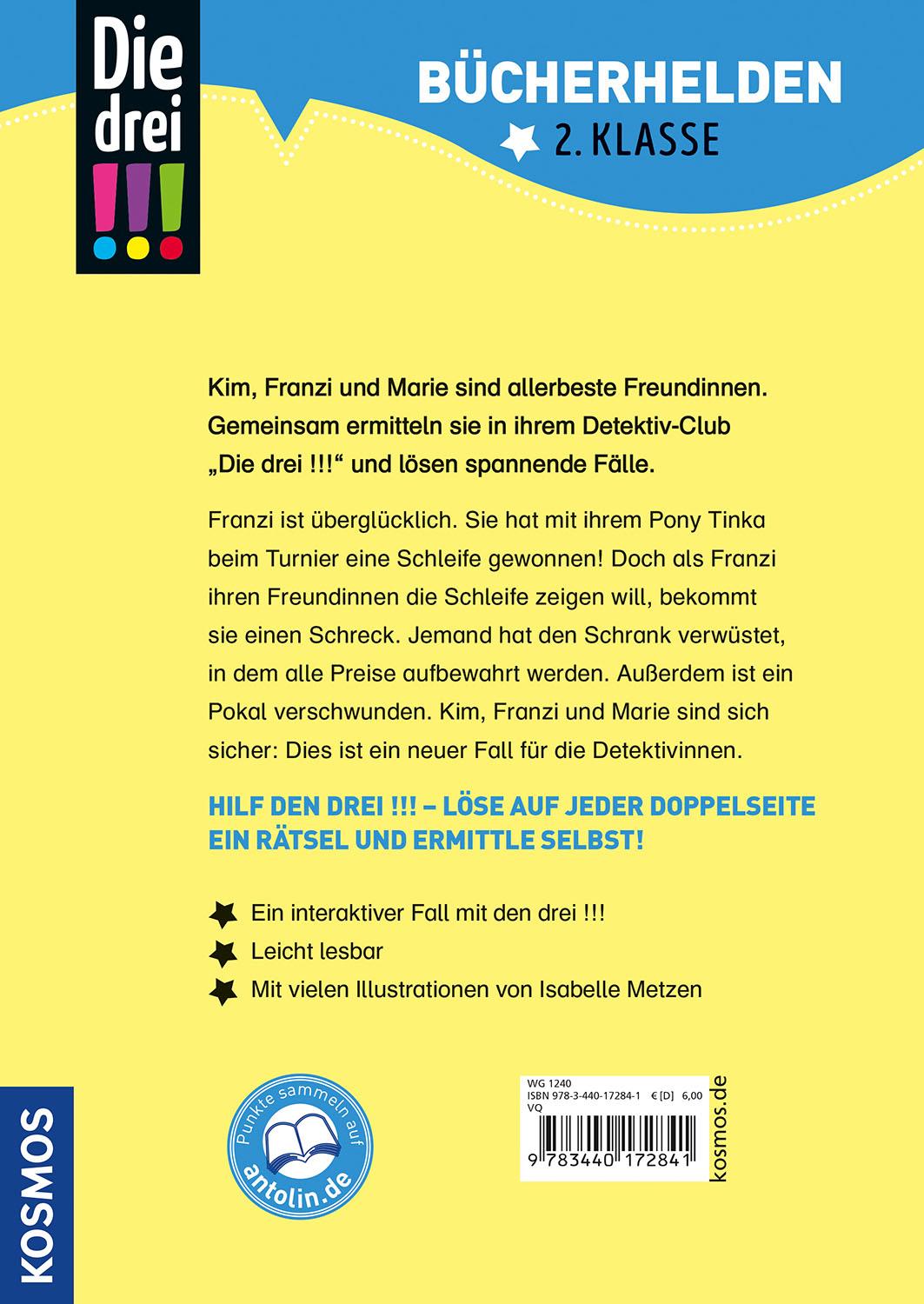 Kim, Franzi und Marie sind beste Freundinnen und Detektivinnen! Zusammen haben die drei !!! schon viele knifflige Fälle gelöst.Franzi ist überglücklich: Sie und ihr Pony Tinka haben beim Reitturnier eine Schleife gewonnen! Doch als Franzi ihren Freundinnen die Trophäe zeigen will, bekommt sie einen Schreck. Jemand hat die Vitrine verwüstet, in der alle Preise aufbewahrt werden. Außerdem ist ein Pokal verschwunden. Ein neuer Fall für die drei !!!.Lesen lernen ist schwer? Nicht mit dieser spannenden Geschichte, die auch Leseanfängerinnen ab Klassenstufe 2 leicht bewältigen können. Illustrationen und ein Detektiv-Rätsel auf jeder Doppelseite machen den Band abwechslungsreich, sorgen für Erfolgserlebnisse und erhöhen die Lese-Motivation. So macht der Einstieg ins selbstständige Bücherlesen einfach Spaß.