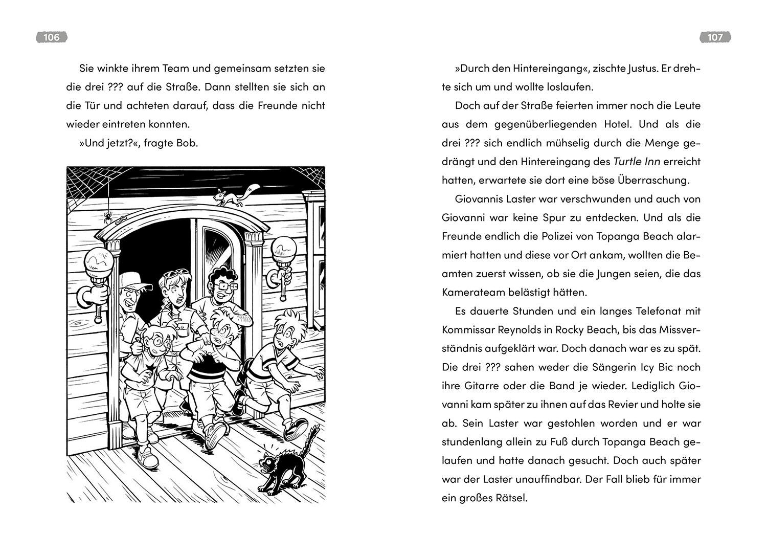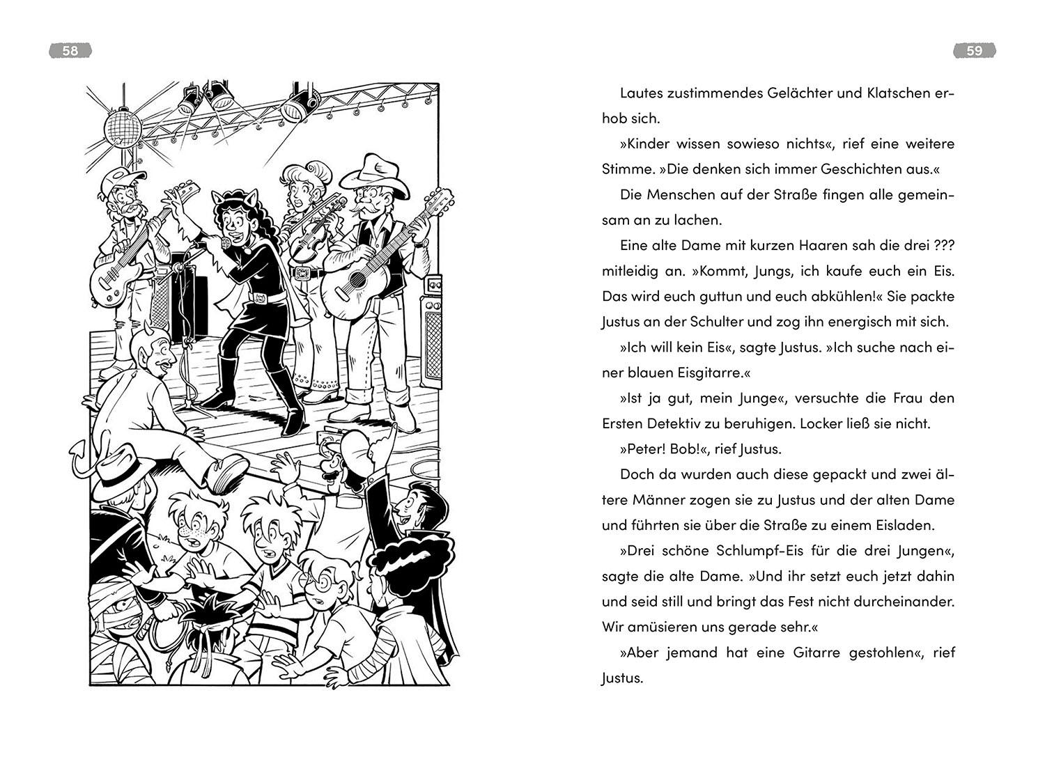 Film ab im Spukhotel! Justus, Peter und Bob sind an einem ganz besonderen Ort untergebracht. Hier wird ein cooles Musikvideo gedreht: Schauspieler spielen Geister und unheimliche Spukerscheinungen. Noch nicht gruselig genug? Plötzlich verschwindet eine wertvolle Gitarre aus der Band. Haben sich vielleicht doch echte Gespenster unter die Schauspieler gemischt? Die drei ??? gehen geheimnisvollen Hinweisen nach und begeben sich in Gefahr. Kinder ab acht Jahren werden zum vierten Ermittler. Sie lösen Rätsel, sammeln Beweise und entscheiden die weiteren Schritte mit: Wie geht die Geschichte aus? Welche Spur führt zum Ziel?