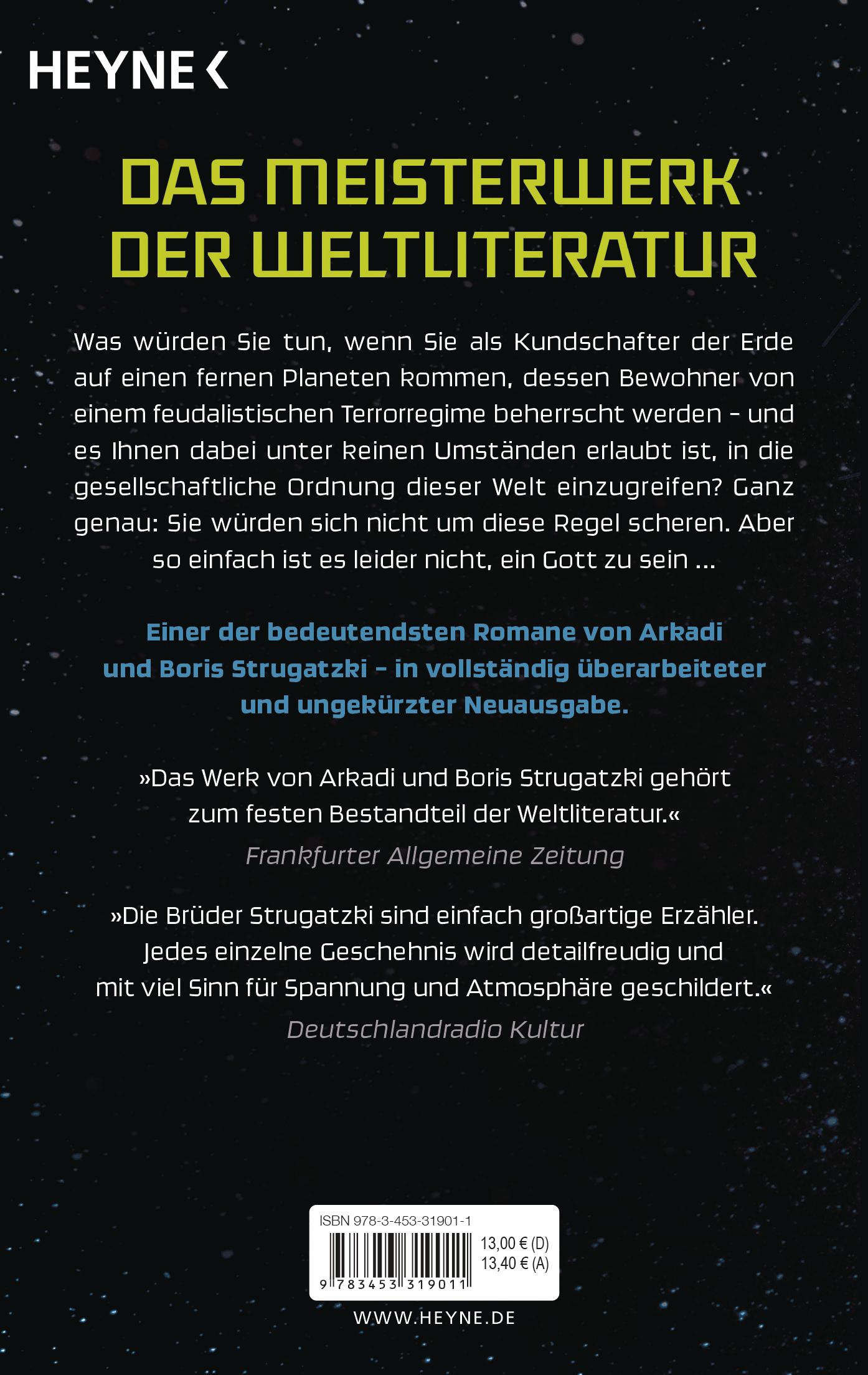 Arkadi und Boris Strugatzki sind nicht nur Autoren von Weltrang, sondern auch Vordenker einer systemkritischen Literatur. Es ist schwer, ein Gott zu sein, 1964 geschrieben, erzählt die Geschichte von Anton, der auf einem fremden, rückständigen Planeten gottgleiche Macht hat, sie aber nicht nutzen darf und daran zerbricht. Über seine versteckte Stalin-Kritik hinaus ist der Roman eine hochaktuelle Auseinandersetzung mit der politischen Verantwortung des Einzelnen.