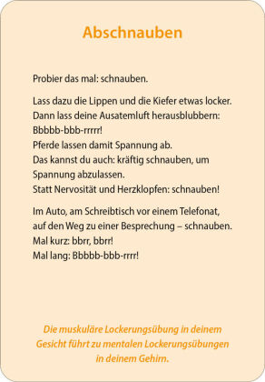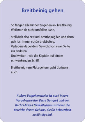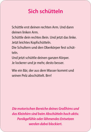 Dieses Kartenset enthält 50 der beliebtesten Übungen wie »Schulterwurf«, »Hand aufs Herz« und »Strohhalm-Atmen«, ergänzt durch 2 Zusatzkarten und ein Booklet mit weiterführenden Informationen. Ein Farbleitsystem sorgt für Orientierung, damit der Leser sofort die für ihn passende Lösung finden kann. Oder er zieht eine oder mehrere Karten nach dem Zufallsprinzip und findet so nützliche Soforthilfe. Die einzelnen Übungen sind nach Themen wie »Energie«, »Keine Panik« und »Ermutigung« sortiert.