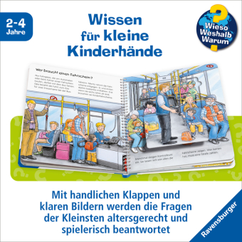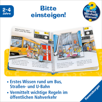 Auf zur Haltestelle, der Bus kommt gleich! Für Kinder stellt eine Fahrt mit öffentlichen Verkehrsmitteln ein echtes Erlebnis dar. Wo kann ich einen Fahrschein kaufen? Wie fährt eine U-Bahn? Wozu dienen die Knöpfe an den Haltestangen? Mithilfe von Bewegungsklappen können die Kinder Fahrgäste in Busse einsteigen und Bahnen aus Tunneln herausfahren lassen. Ein lustiges Suchspiel lädt dazu ein, die im Bus vergessenen Fundsachen dem richtigen Besitzer zuzuordnen.