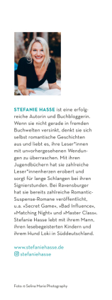 Stefanie Hasse ist eine erfolgreiche Autorin und Buchbloggerin. Wenn sie nicht gerade in fremden Buchwelten versinkt, denkt sie sich selbst romantische Geschichten aus und liebt es, ihre Leser_innen mit unvorhergesehenen Wendungen zu überraschen. Bei Ravensburger hat sie bereits zahlreiche Romantic-Suspense-Romane veröffentlicht, u.a. "Bad Influence", "Matching Night" und "Master Class". Stefanie Hasse lebt mit ihrer Familie in Süddeutschland.