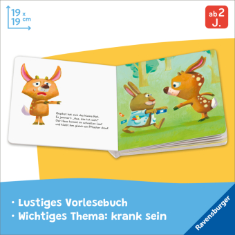 Husten, Schnupfen, Halskratzen und Bauchweh - wer kennt es nicht? Das Reh braucht ein Pflaster, der Nasenbär ein Taschentuch und das Robbenkind bekommt Medizin gegen die Ohrenschmerzen. Die Tiere werden getröstet und gesund gepflegt, bis es am Ende allen wieder gut geht. Elf lustige Reime über kranke Tiere bieten ein großes Vorlesevergnügen, das wunderbar geeignet ist, um kleine Schnupfennasen bei Laune zu halten. Die humorvollen Bilder bringen Groß und Klein zum Schmunzeln.