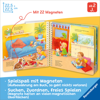Der Kochtopf gehört auf den Herd. Wo ist Leos Boot? Und wo wohnen die Fische? In diesem Spielbuch laden 22 stabile Magnetteile dazu ein, bekannte Situationen aus dem Kinderalltag zuzuordnen. Dank der vollmagnetischen Seiten können die Kinder aber auch ganz frei mit den Magneten spielen und eigene Ideen umsetzen. Das fördert Kreativität und Feinmotorik.