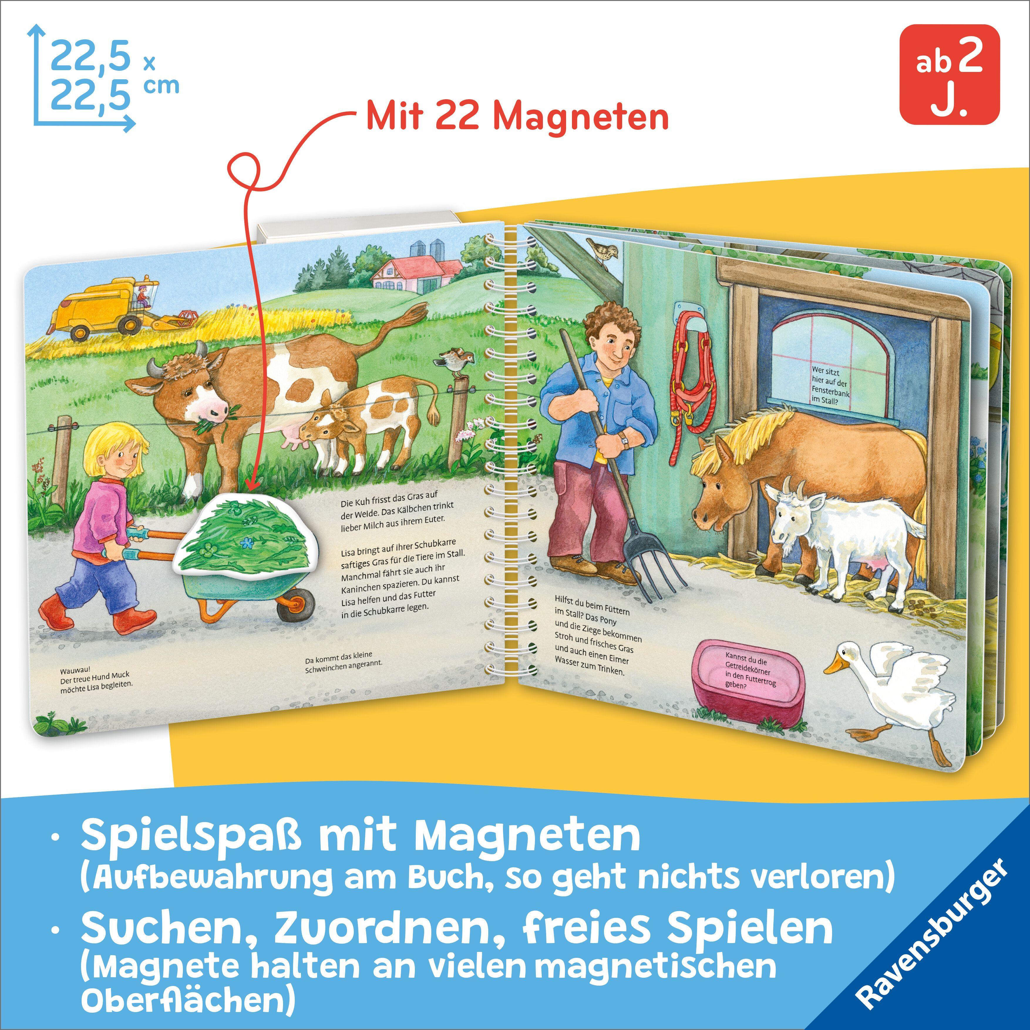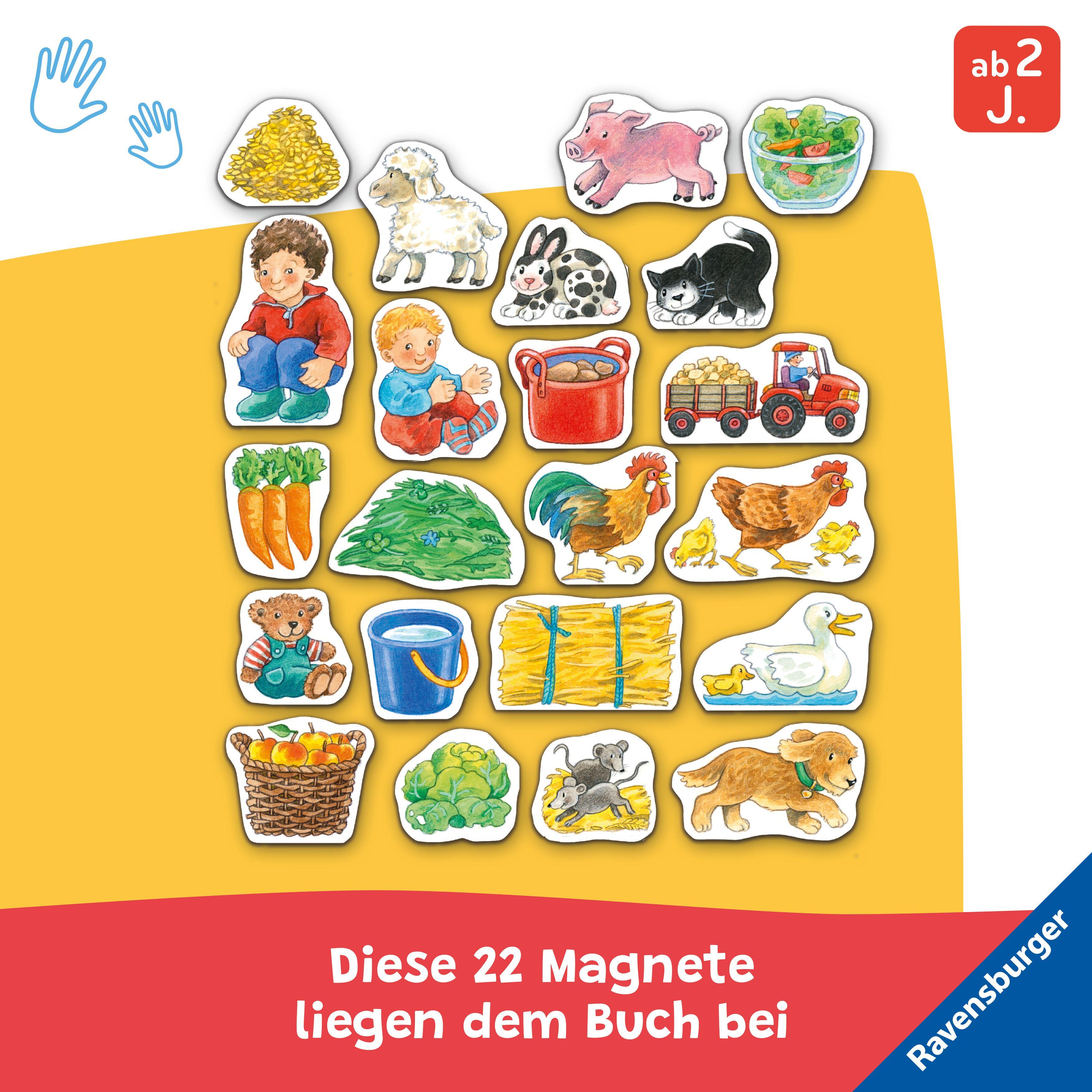 Hilfst du dabei, die Tiere zu füttern? Magnete zuordnen oder frei spielen: Dieses Bauernhof-Buch bietet viele spannende Möglichkeiten. Kleinkinder entdecken hier, wie die Tiere auf Lisas Bauernhof versorgt werden und welche Arbeit auf dem Land anfällt. Dank der 22 Magnete können die Kleinen auch spielerisch in die Geschichte eingreifen und dabei helfen, die Tiere zu füttern. Die ausklappbare Doppelseite am Schluss bietet viele weitere Spielmöglichkeiten.Auf dem Bauernhof müssen die Tiere gefüttert werden. Wer hilft Lisa und ihrer Familie dabei? Mit diesem spannenden Magnet-Spielbuch können Kinder ab 2 Jahren immer wieder anders spielen. Die 22 Magnete können den passenden Seiten zugeordnet werden, aber auch außerhalb des Buchs verwendet werden. Das fördert die Kreativität und Feinmotorik. Die tolle Ausklappseite am Ende des Buchs bietet noch mehr Spielspaß.