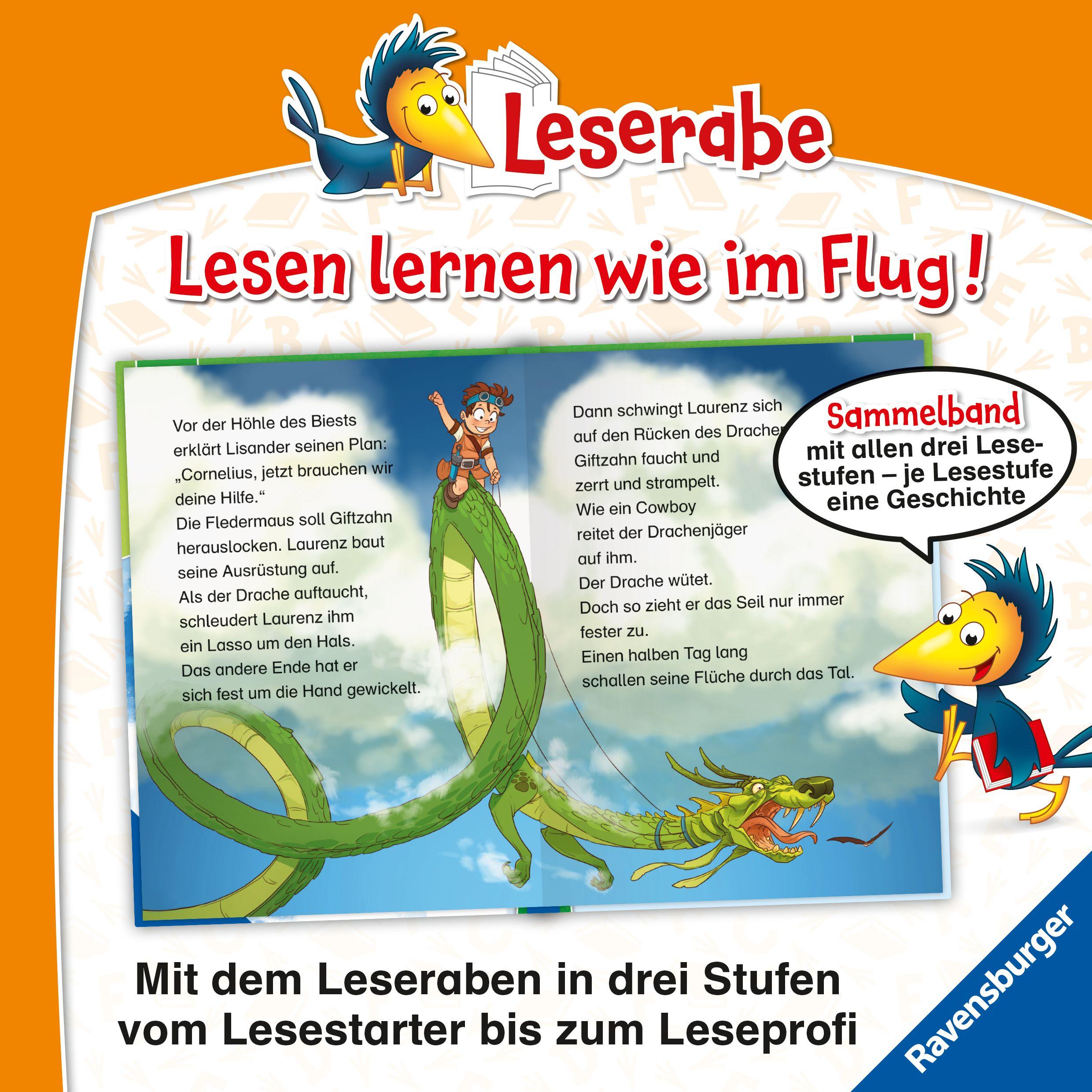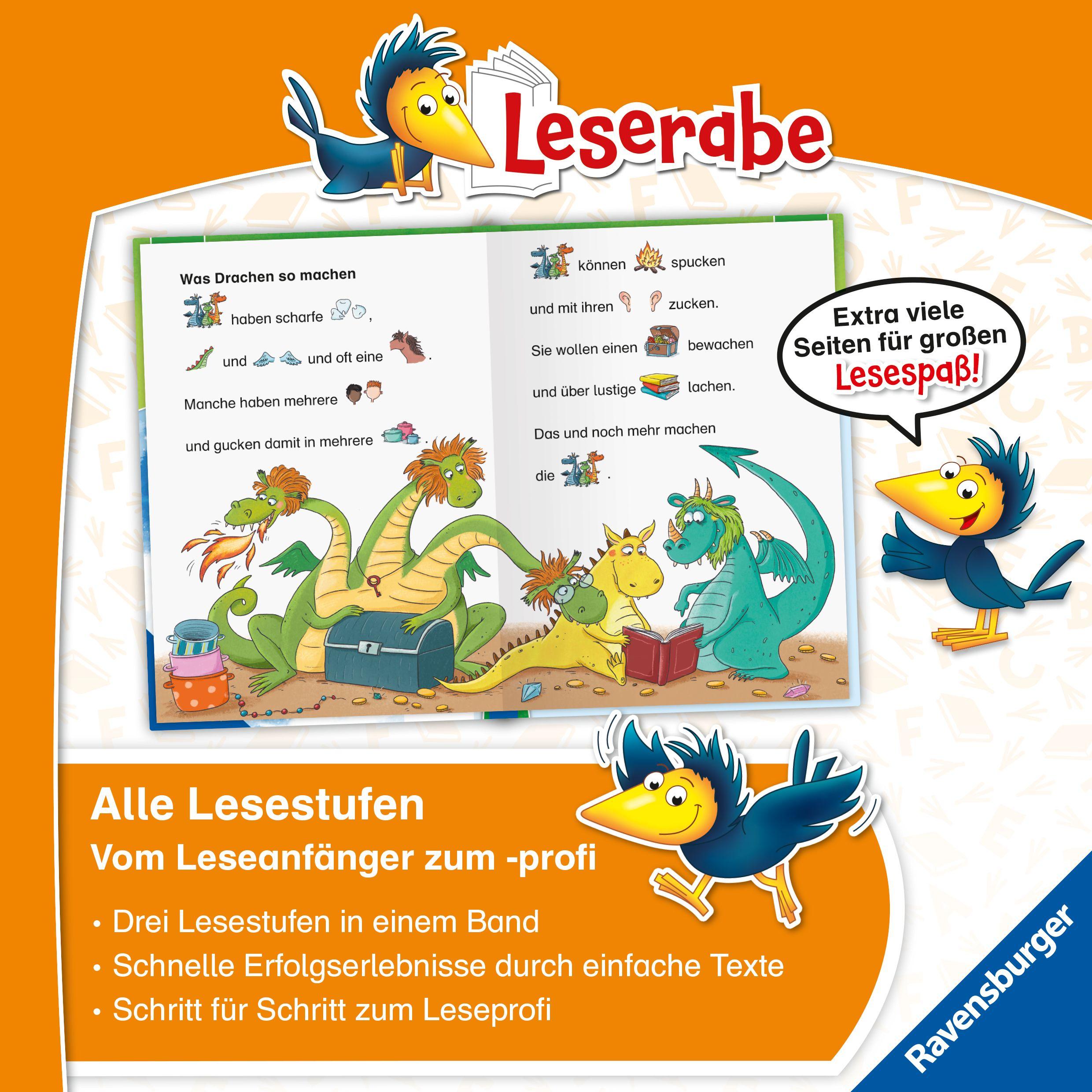 Lesen lernen wie im Flug!Schritt für Schritt Lesen lernen mit drei spannenden Erstleser-Geschichten: Ein gefährlicher Drache bewacht einen Schatz, die Ritter lösen knifflige Rätsel auf der Rätselburg und die Drachenjäger wagen sich in die Höhle des Drachens. Da kommt Abenteuerlaune auf und das Lesenlernen macht richtig Spaß! Lesen lernen wie im Flug! Die Kinderbücher der Reihe Leserabe wurden mit Pädagogen entwickelt. Sie begleiten Kinder von 6 - 8 Jahren auf ihrem Weg vom Lesestarter zum Leseprofi. In drei Stufen wird spielerisch Lesekompetenz vermittelt: Die Vorlesestufe, bei der Kinder schon die Bilder mitlesen können, die 1. Lesestufe mit einfachen Texten in großer Fibelschrift und die 2. Lesestufe für fortgeschrittene Leser. Dieser Sammelband enthält 3 Leseraben-Bücher aus jeder Stufe. Schritt für Schritt wird so das Lesenlernen eingeübt: "Drachengeschichten" (Vor-Lesestufe), "Rittergeschichten" (1. Lesestufe) und "Drachenjagd auf Vukanien" (2. Lesestufe).Empfohlen von Stiftung Lesen, gelistet bei Antolin.