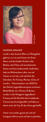 Sandra Grauer wurde 1983 im Ruhrgebiet geboren. Schreiben, Lesen und in die Welt fremder Geschichten eintauchen war schon immer ihre Leidenschaft. In Heidelberg studierte sie Sprach- und Übersetzungswissenschaften, später absolvierte sie ein fachjournalistisches Fernstudium und ein Volontariat in einer PR-Agentur in Karlsruhe. Mit ihrer Familie lebt sie inzwischen wieder im Ruhrgebiet. Sie schreibt hauptsächlich Romane für Jugendliche und Frauen, aber auch Krimis.