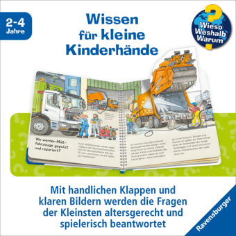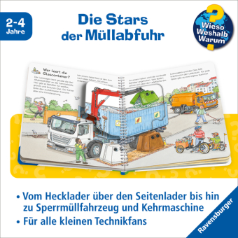 Wenn es vor dem Fenster rumpelt, ist es endlich da: das Müllauto. Kleine Kinder beobachten gebannt, wie Müllwerker die Tonnen per Knopfdruck leeren. Klappen im Buch zeigen, wie der Absetzkipper Bauschutt wegbringt, das Sperrmüllfahrzeug große Gegenstände vom Straßenrand abholt und die Kehrmaschine die Rinnen von Laub und Schmutz reinigt. Auch Müllfahrzeuge müssen regelmäßig geputzt und gewartet werden. Auf einer Wimmelseite gilt es, alle Fahrzeuge und Gegenstände im Bild wiederzufinden.