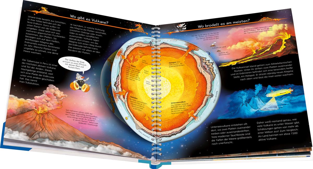 Was spuckt ein Vulkan aus? Warum sind nicht alle Berge Vulkane? Was haben sie mit Tsunamis und Erdbeben zu tun? Mit Klappen schauen Kinder über den Kraterrand, bewegen die Erdplatten und lassen die Feuerberge ausbrechen. Sie gehen auf eine Reise von der Eifel bis ins All. Dabei tauchen sie zu Unterwasservulkanen in die Tiefsee, bestaunen Islands Geysire und erklimmen den Sabancaya in Peru. Seite für Seite entdecken sie jede Menge Sachwissen über Vulkane sowie deren Entstehung und Erforschung.
