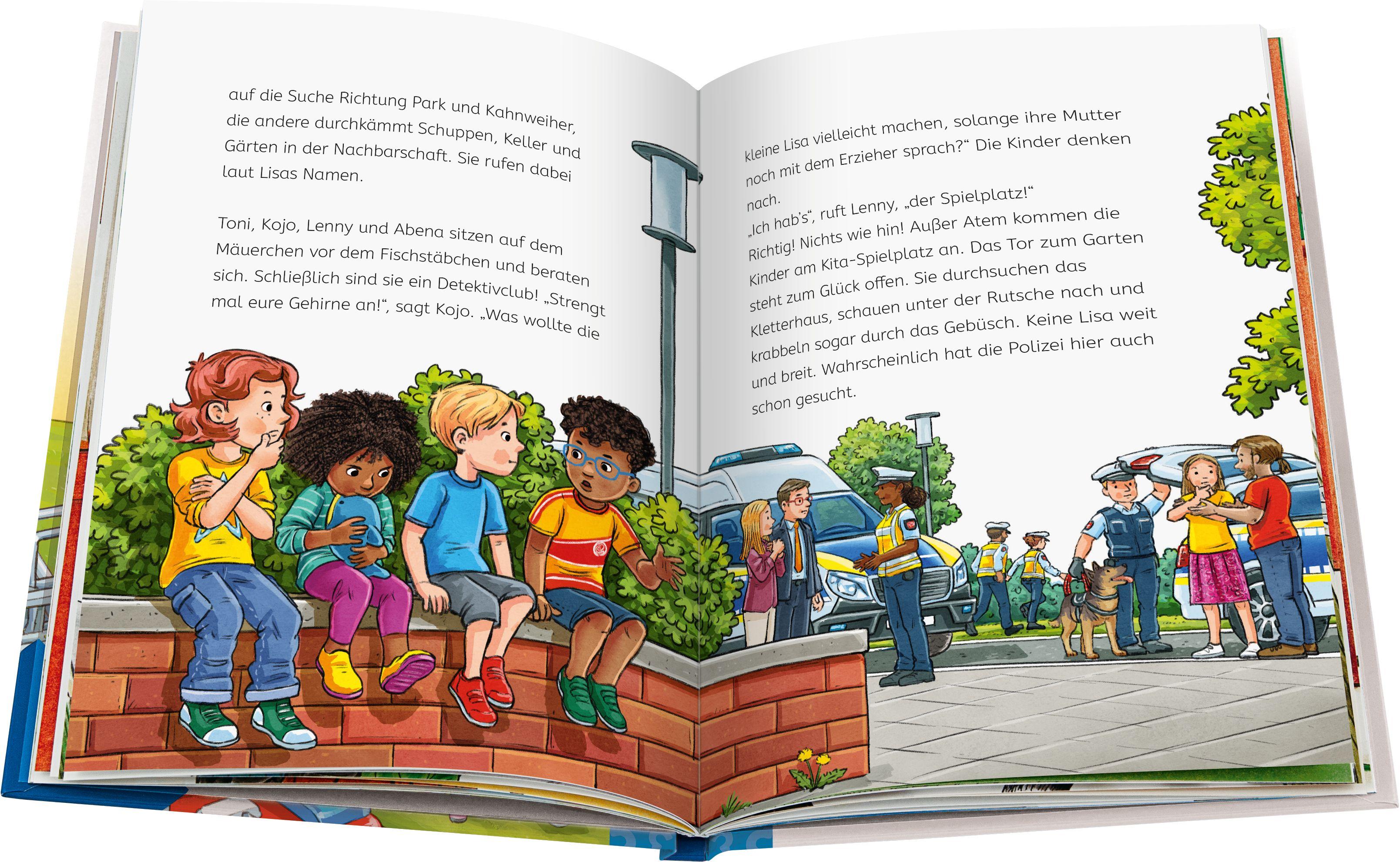 Hier ist mächtig was los: Die Kinder Toni, Abena, Kojo und Lenny sind hautnah dabei, wenn die Feuerwehr eine brennende Mülltonne löscht, Tonis Katze aus einem Baum rettet und ein Hornissennest umsiedelt. Als Hobby-Detektive stellen die Kinder ihren Spürsinn unter Beweis und helfen bei einer Suchaktion der Polizei. Auch im Fußballstadion und am Badesee schauen sie mutigen Einsatzkräften über die Schulter. Jede der 15 abgeschlossenen Geschichten bietet kleine Häppchen Sachwissen.
