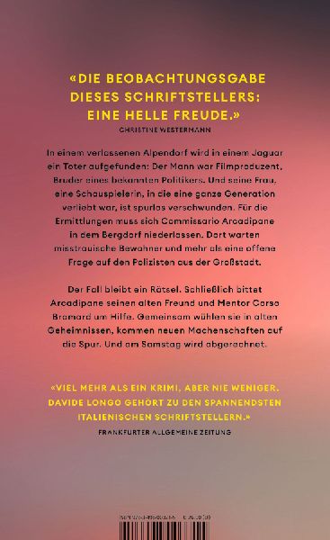 Ein atmosphärischer Kriminalroman, der zwischen einem einsamen piemontesischen Bergdorf und der lärmenden Kino- und Politikmetropole Rom spielt: «Longo ist einer der fabelhaftesten Schriftsteller Italiens.» Die Welt
