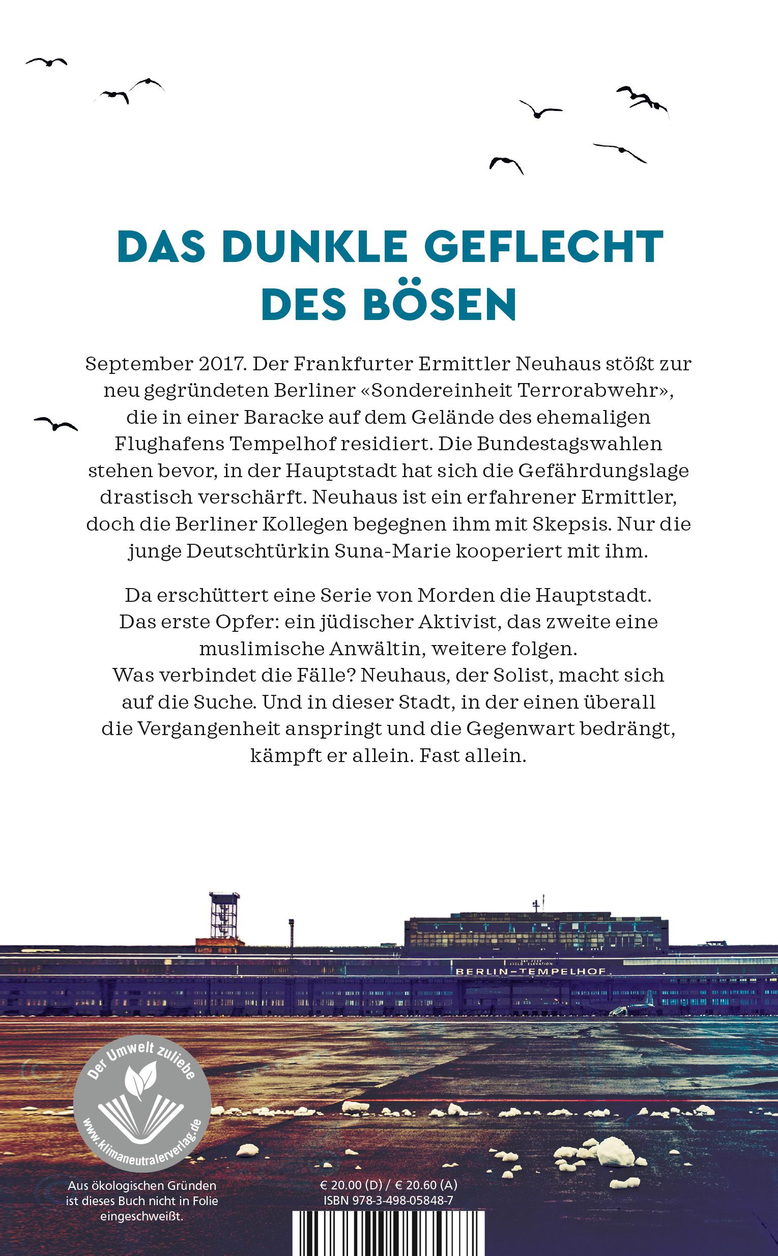 Polizist wird man aus Überzeugung. Was, wenn es die falsche ist?September 2017. Der Frankfurter Ermittler Neuhaus stößt zur neu gegru¿ndeten Berliner «Sondereinheit Terrorabwehr», die in einer Baracke auf dem Gelände des ehemaligen Flughafens Tempelhof residiert. Die Bundestagswahlen stehen bevor, in der Hauptstadt hat sich die Gefährdungslage drastisch verschärft. Neuhaus ist ein erfahrener Ermittler, doch die Berliner Kollegen begegnen ihm mit Skepsis. Nur die junge Deutschtu¿rkin Suna-Marie kooperiert mit ihm.Da erschu¿ttert eine Serie von Morden die Hauptstadt. Das erste Opfer: ein ju¿discher Aktivist, das zweite eine muslimische Anwältin, weitere folgen.Was verbindet die Fälle? Neuhaus, der Solist, macht sich auf die Suche. Und in dieser Stadt, in der einen u¿berall die Vergangenheit anspringt und die Gegenwart bedrängt, kämpft er allein. Fast allein.