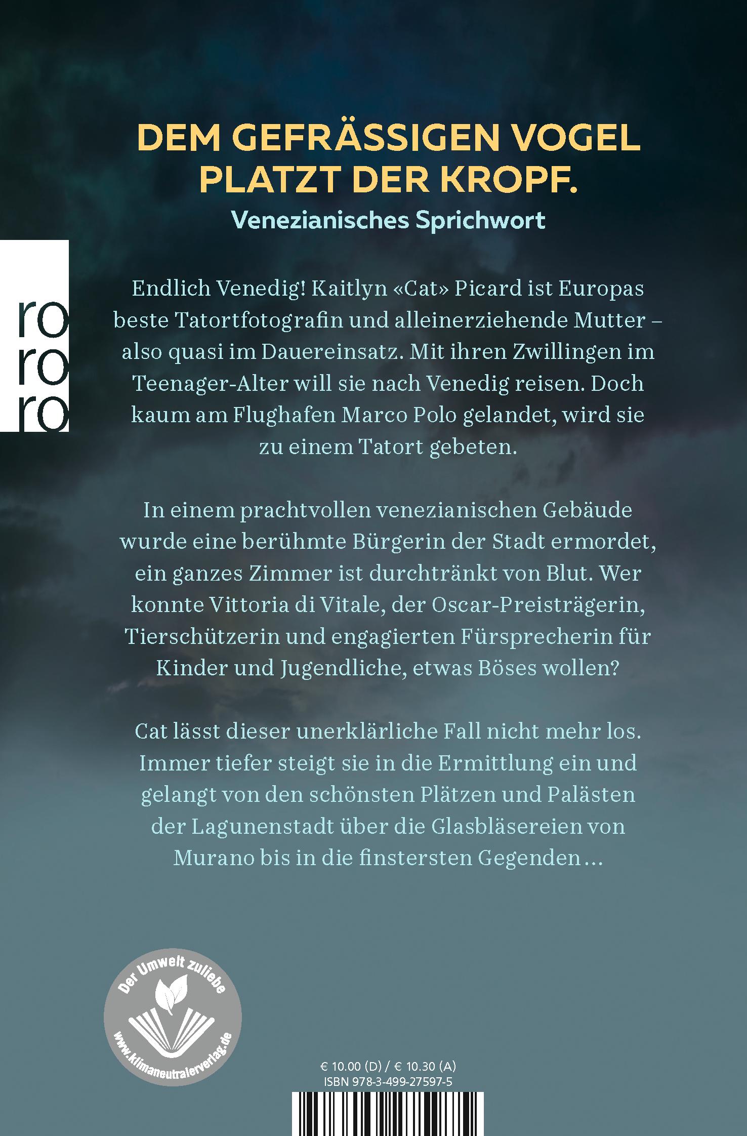 Endlich Venedig! Kaitlyn «Cat» Picard ist Europas beste Tatortfotografin und alleinerziehende Mutter - also quasi im Dauereinsatz. Mit ihren Zwillingen im Teenager-Alter will sie nach Venedig reisen. Doch kaum am Flughafen Marco Polo gelandet, wird sie zu einem Tatort gebeten.In einem prachtvollen venezianischen Gebäude wurde eine beru¿hmte Bu¿rgerin der Stadt ermordet, ein ganzes Zimmer ist durchtränkt von Blut. Wer konnte Vittoria di Vitale, der Oscar-Preisträgerin, Tierschu¿tzerin und engagierten Fu¿rsprecherin fu¿r Kinder und Jugendliche, etwas Böses wollen?Cat lässt dieser unerklärliche Fall nicht mehr los. Immer tiefer steigt sie in die Ermittlung ein und gelangt von den schönsten Plätzen und Palästen der Lagunenstadt u¿ber die Glasbläsereien von Murano bis in die finstersten Gegenden ...