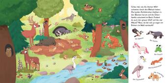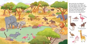 Wo ist die Giraffe und wo ist der Tiger? Wo ist der Hase, der Schmetterling, der Wal und der Fuchs? Ob im Ozean oder in der Savanne, dem heimischen oder fernen Wald, hier können Kinder ab 18 Monaten in farbenfrohen, dateilreichen Schauseiten auf Entdeckungsreis gehen. Sie können bekannte Tiere wiedererkennen und neue Tiere kennenlernen.